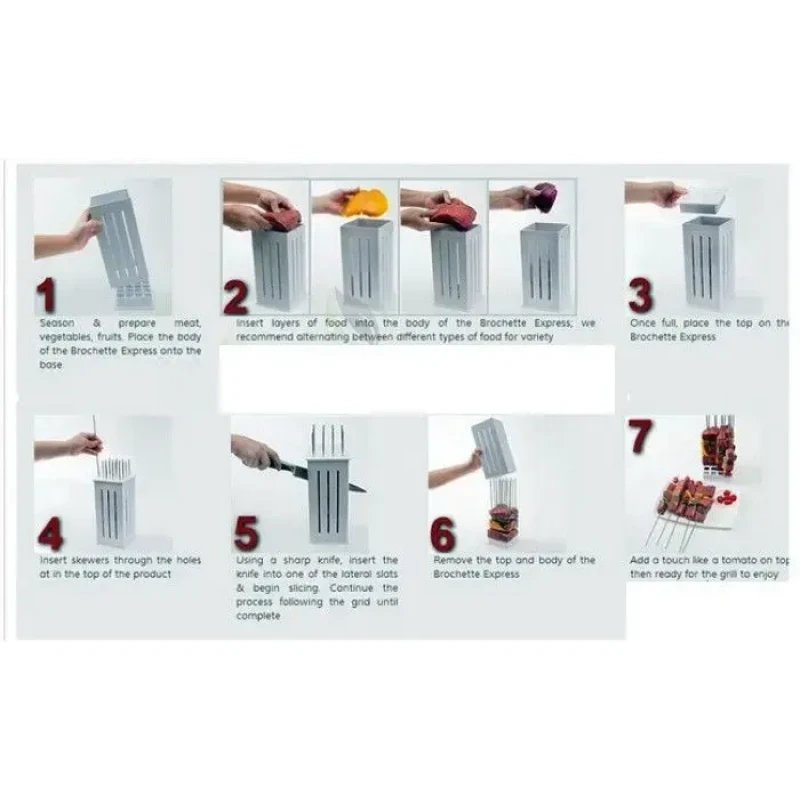 З Brochette Express ви зможете готувати швидше та акуратніше. Пристрій досить простий в експлуатації. Після того, як були приготовлені фрукти, овочі, м'ясо необхідно закласти всі компоненти всередину конструкції. Найкраще укладати всі шарами.