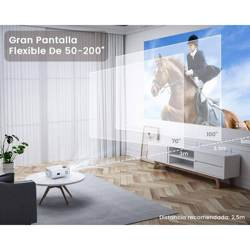 Цей проектор із підтримкою 1080p може запропонувати великий розмір проекції від 70 до 200 дюймів з відстані від 1,5 до 6 м, що дозволяє насолоджуватися фільмами з родиною чи друзями на великому екрані. Крім того, ви можете регулювати або зменшити розмір зображення за допомогою пульта дистанційного керування безпосередньо за допомогою функції масштабування 75% -100%, ви також можете повернути зображення, коли воно прикріплене до стелі.
