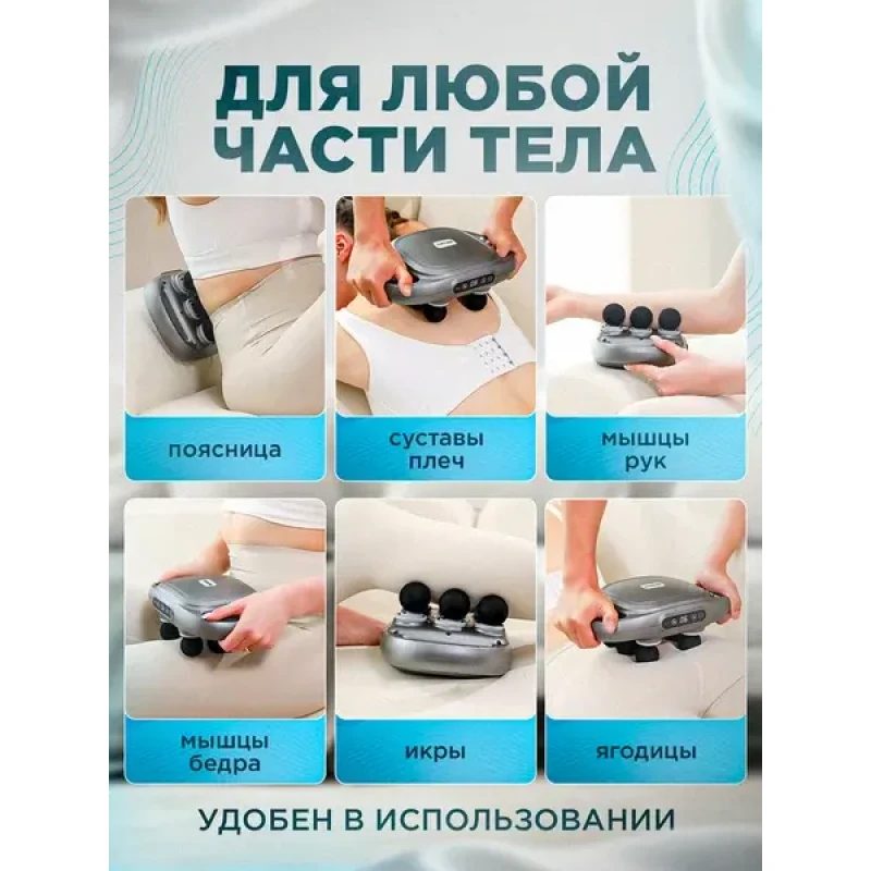 - Універсальне застосування: Цей масажер не тільки підходить для спини та тіла, але й для інших областей, включаючи шию, обличчя, живіт та ноги. Він також може бути використаний для різних цілей, таких як масаж, усунення целюліту, релаксація або післятренувальне відновлення.