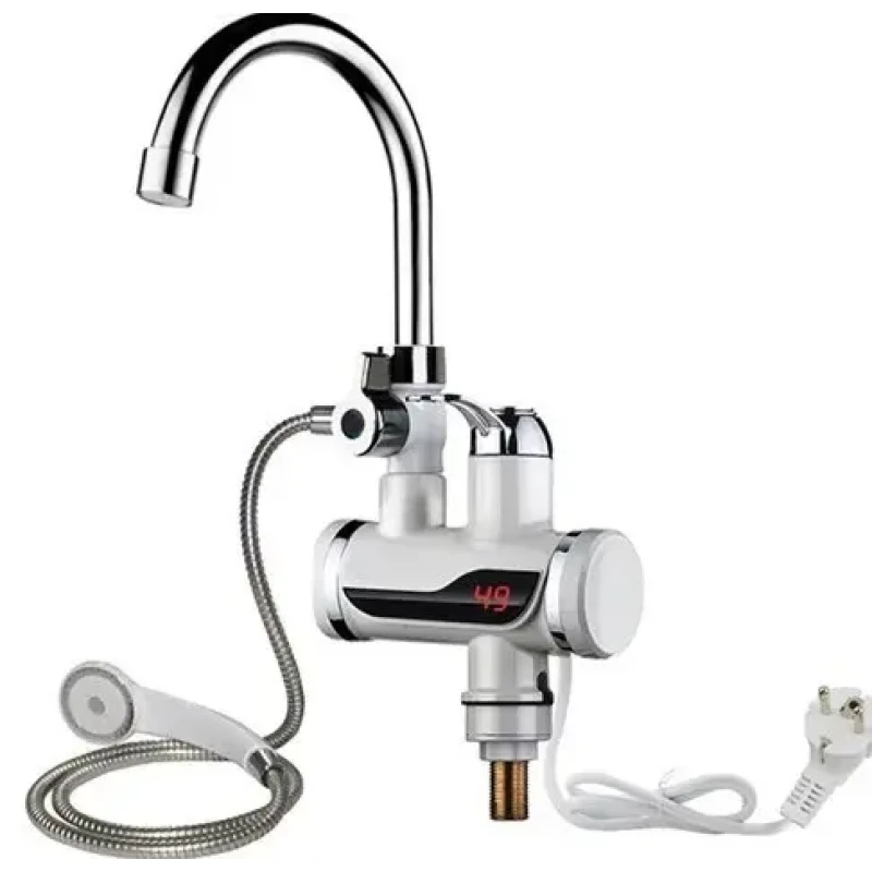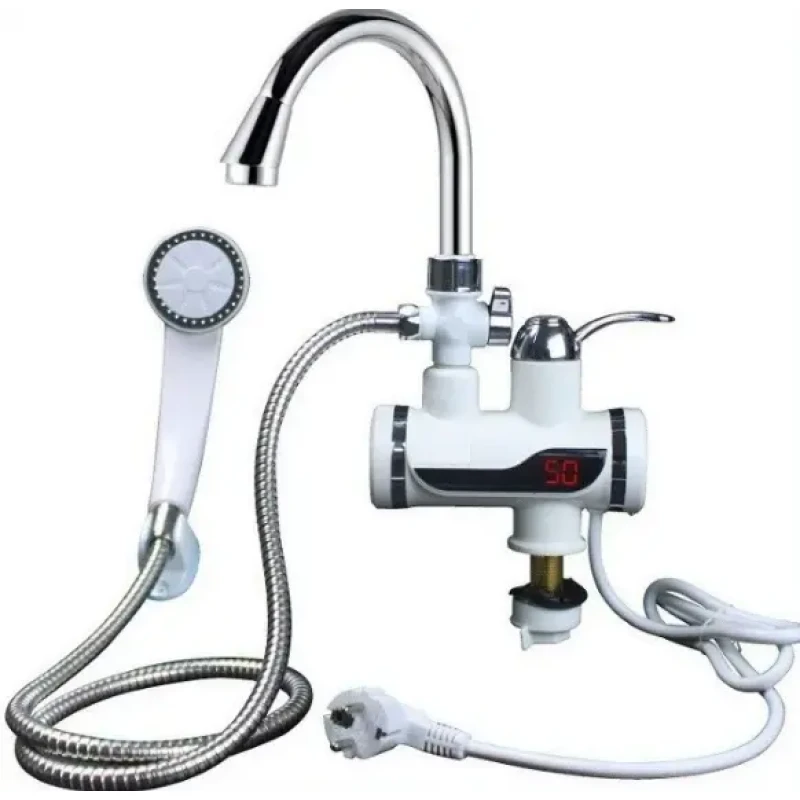 Він встановлюється замість крана та підключається до електромережі. Через кілька секунд із крана ллється гаряча вода. В електричному водонагрівачі встановлений терморегулятор, який швидко нагріває воду. Ця модель йде в комплекті з душем, тому Ви можете встановити цей комплект у ванну кімнату.