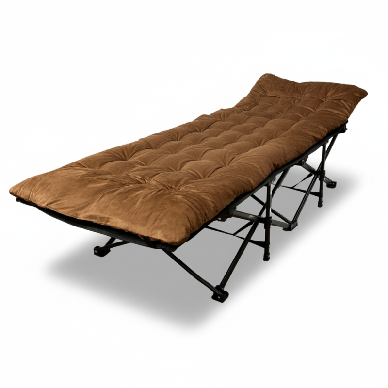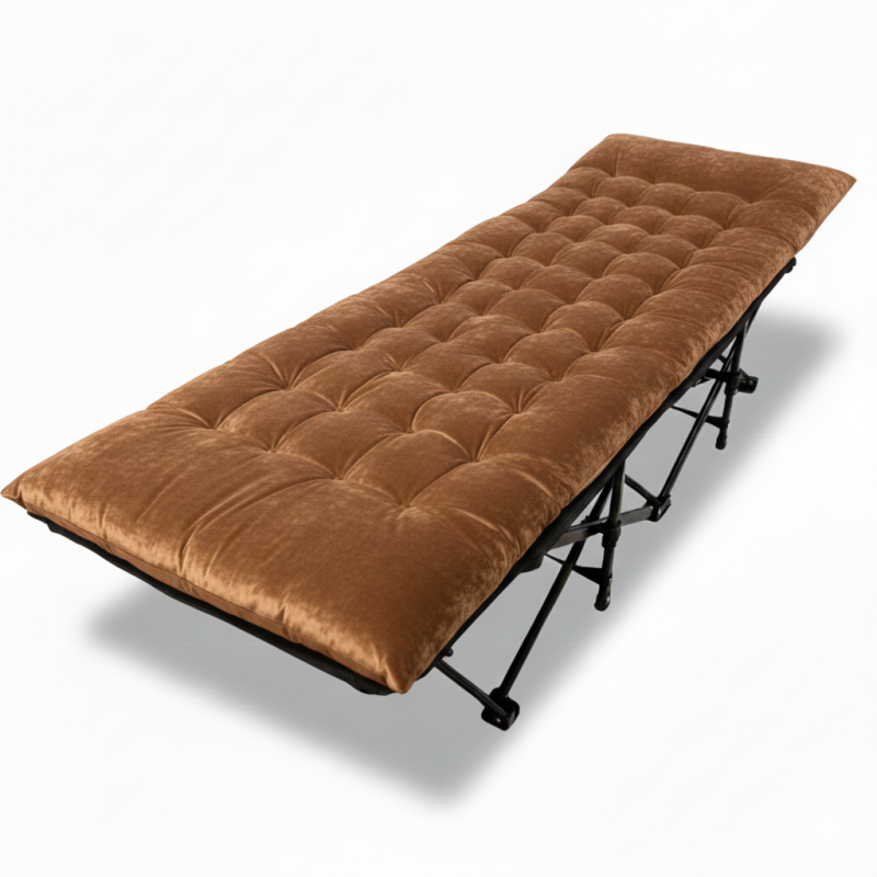 Розкладачка для туризму LEOBRO з товстим оксамитовим матрацом — це зручне та надійне рішення для кемпінгу, подорожей, риболовлі або відпочинку на природі. Модель поєднує міцну конструкцію, продуману ергономіку та максимальний комфорт завдяки оксамитовому матрацу підвищеної товщини. Особливості моделі Товстий оксамитовий матрац Матрац виготовлений з м’якого, приємного на дотик оксамиту. Завдяки збільшеній товщині забезпечує комфортний сон і правильну підтримку тіла навіть на нерівній поверхні. Зносостійкі матеріали Верх матраца оксамитовий, внутрішній шар — текстиль та поліестер, наповнювач — м’яка штучна бавовна, яка добре тримає форму та не деформується з часом. Міцна складна конструкція Каркас виготовлений зі сталевої труби з порошковим покриттям. Матеріал витримує великі навантаження, не піддається корозії та забезпечує довговічність розкладачки. Легка в складанні та транспортуванні Механізм дозволяє швидко скласти та розкласти конструкцію за кілька секунд.
