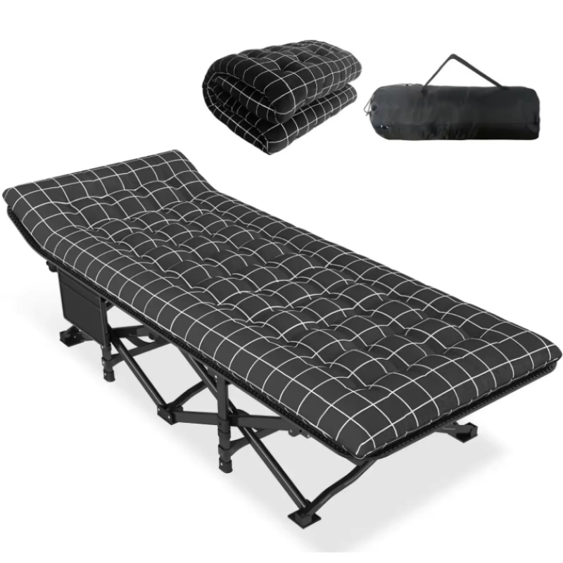 Розкладачка для туризму LEOBRO з товстим оксамитовим матрацом (LB-CC-L2-PAT) — це зручне та надійне рішення для кемпінгу, подорожей, риболовлі або відпочинку на природі. Модель поєднує міцну конструкцію, продуману ергономіку та максимальний комфорт завдяки оксамитовому матрацу підвищеної товщини. Особливості моделі Товстий оксамитовий матрац Матрац виготовлений з м’якого, приємного на дотик оксамиту. Завдяки збільшеній товщині забезпечує комфортний сон і правильну підтримку тіла навіть на нерівній поверхні. Зносостійкі матеріали Верх матраца оксамитовий, внутрішній шар — текстиль та поліестер, наповнювач — м’яка штучна бавовна, яка добре тримає форму та не деформується з часом. Міцна складна конструкція Каркас виготовлений зі сталевої труби з порошковим покриттям. Матеріал витримує великі навантаження, не піддається корозії та забезпечує довговічність розкладачки. Легка в складанні та транспортуванні Механізм дозволяє швидко скласти та розкласти конструкцію за кілька секунд.