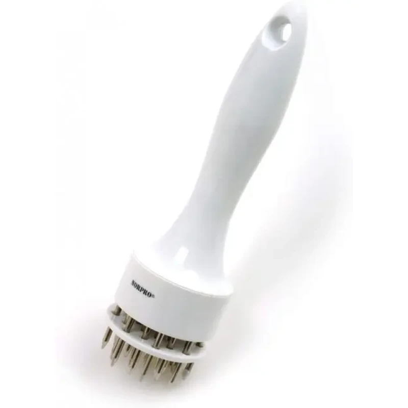 - За допомогою паралельних лез-голок на поверхню шматка м'яса наносяться насічки. Надрізи руйнують сполучну тканину та збільшують площу продукту.