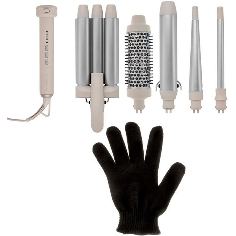 Trendology 5-in-1 Multi-Styler містить п'ять змінних насадок для створення різноманітних зачісок від пружних локонів до об'ємних хвиль. Керамічне покриття з турмаліном зменшує статичну електрику, забезпечуючи гладкість волосся. Нагрівання завершується за 40 секунд до 210 °C у п'яти цифрових режимах з LED-дисплеєм та функцією Auto Memory. Система фіксації тримає насадки надійно, кнопка звільнення полегшує заміну, шнур 180 см обертається.