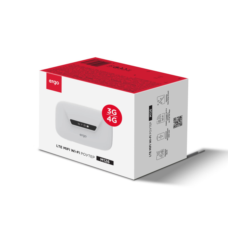 ERGO M126 – це мережевий пристрій, що поєднав у компактному форм–факторі мобільні мережеві технології та збільшену автономність, завдяки чому ви можете отримати доступ до всесвітньої мережі Інтернет практично будь-де та будь-коли.