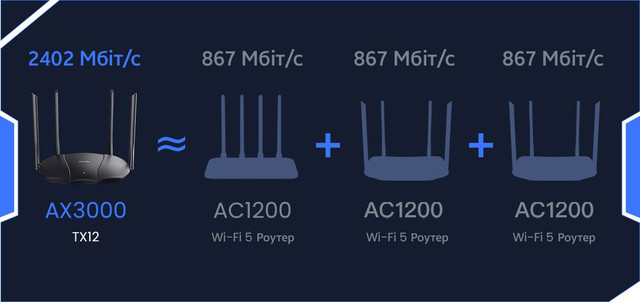TX12 має дводіапазонну одночасну швидкість до 2976 Мбіт/с: 2402 Мбіт/с у діапазоні 5 ГГц і 574 Мбіт/с у діапазоні 2,4 ГГц. Він також підтримує надвелику смугу пропускання 160 МГц, яку можна використовувати з мобільними телефонами, що її підтримують. Це дозволяє сигналу вільно поширюватися по ширшому каналу, максимізуючи продуктивність ваших пристроїв та покращуючи роботу в інтернеті.