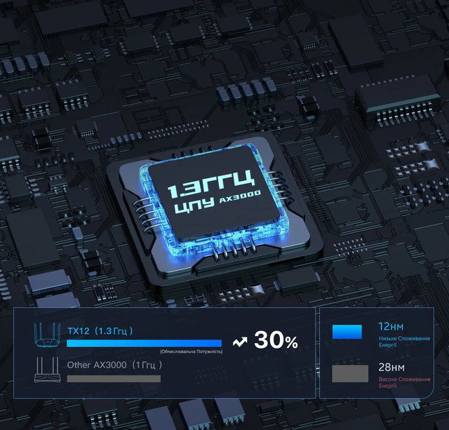 TX12 оснащений двоядерним процесором з тактовою частотою 1,3 ГГц, виготовленим за 12 нм техпроцесом. Його загальна обчислювальна потужність на 30% вища, ніж у старого двоядерного маршрутизатора AX3000. Завдяки цьому маршрутизатор споживає менше енергії та виділяє менше тепла, а його потужність забезпечує стабільну та безперебійну роботу мережі.