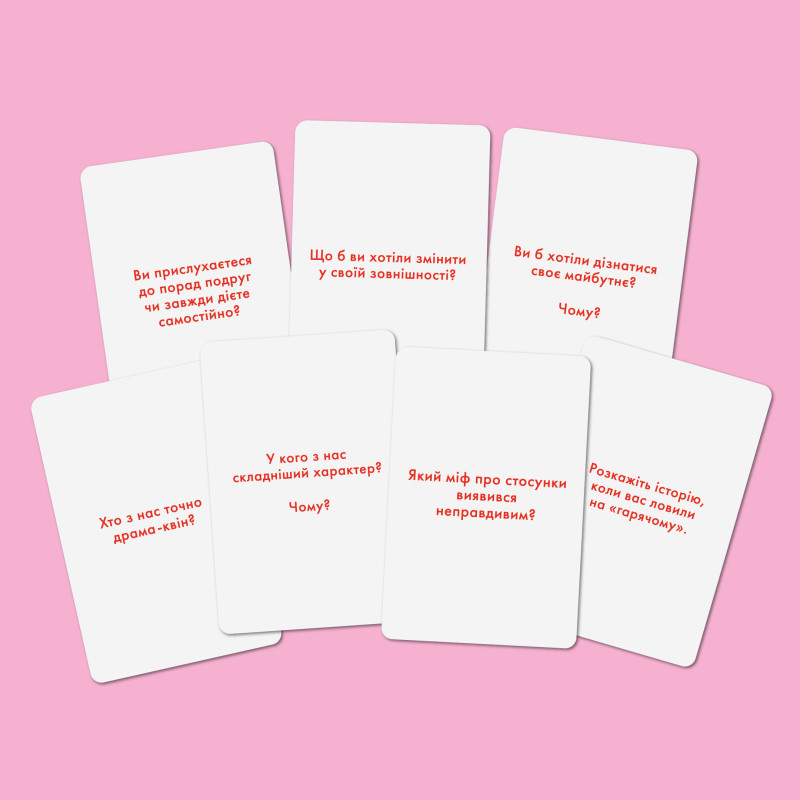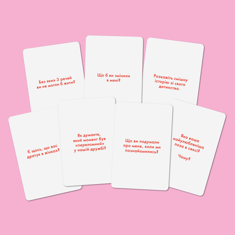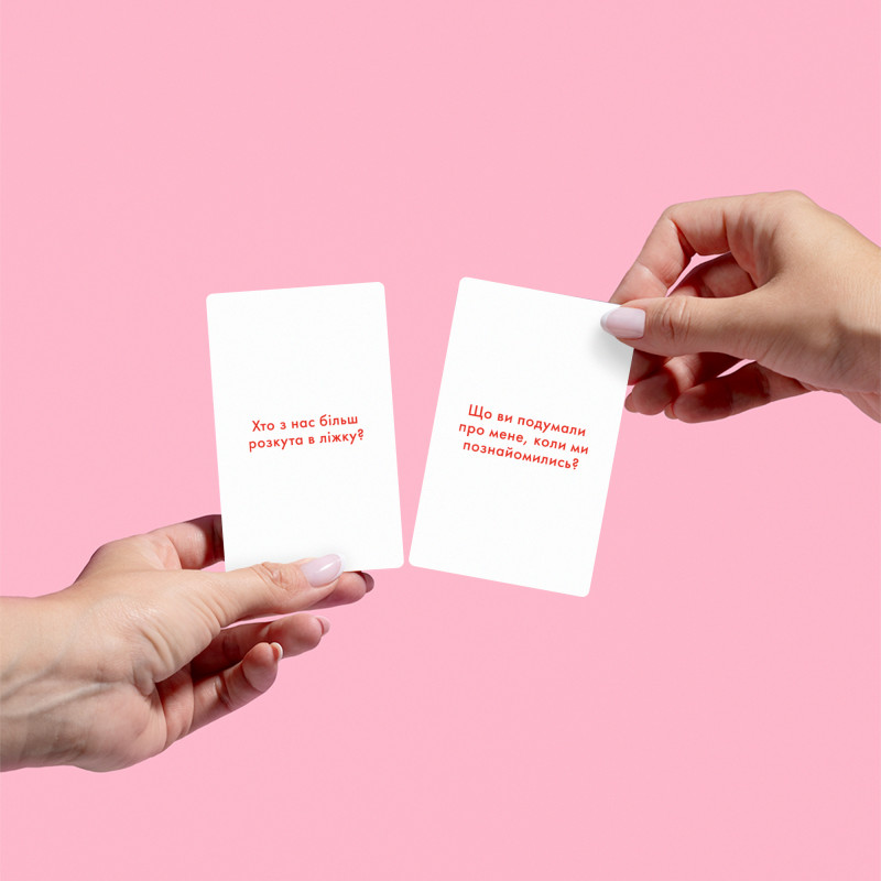 У грі 180 карток із запитаннями, які поділені на 3 категорії: просте, цікаве та гаряче. У них про загальне, особисте та дуже відверте. Відповідайте всі разом на одну картку або ж тягніть по черзі.