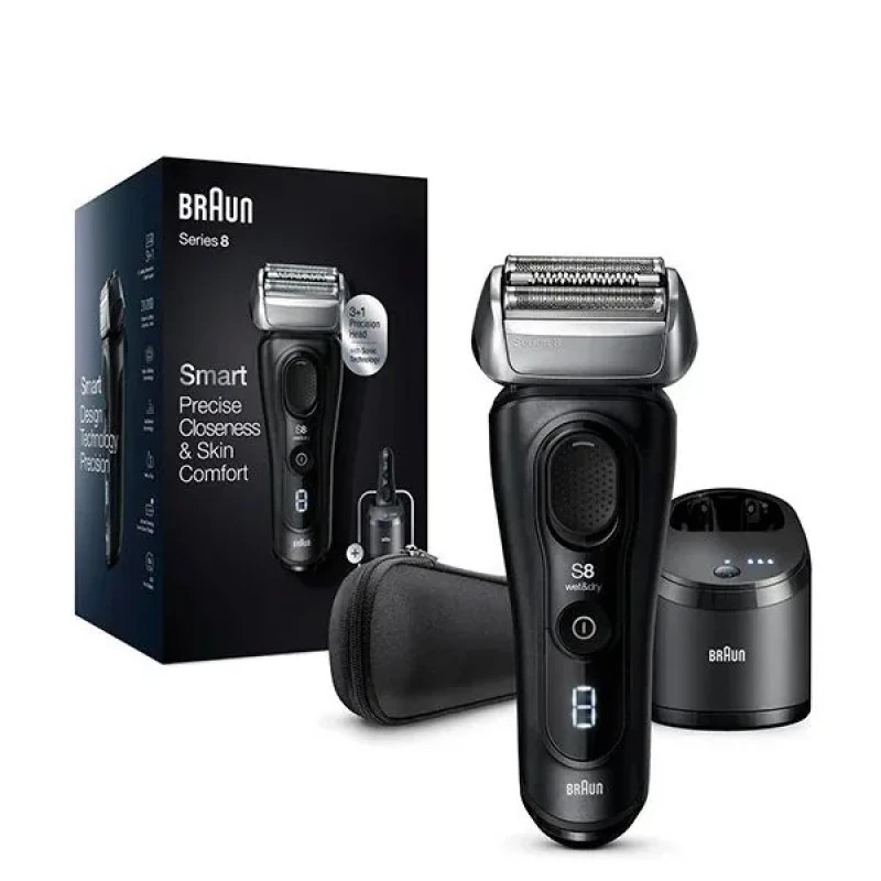 Тип Електробритви Виробник Braun Стать Для чоловіків Модель 8460cc Серія Series 8 Колір Чорний Тип гоління Мокрий Сухий Система гоління Сіткова Кількість бритвених елементів, шт 3 Оснащення Можливість вологого гоління Плаваючі головки Рухомий бритвений блок Дисплей Швидка зарядка Індикатор рівня зарядки Система самоочищення Підставка для зарядки Можливість вологого очищення під струменем Час зарядки акумулятора, год 1 Час роботи бритви від акумулятора, хв 60 Система живлення Акумулятор Тип акумулятора Li-ion Країна виробник Німеччина Чоловіча електробритва Braun 8460cc Series 8 Smart має водонепроникний корпус, тому призначена як для сухого, так і для вологого гоління. Потужний електродвигун та мікровібраційна звукова технологія дають змогу зрізати більшу кількість волосинок за один прохід, у порівнянні з бритвами попередніх поколінь. Плаваюча головка разом з унікальною конструкцією різальних блоків забезпечують неймовірно гладке та безпечне гоління. Компанія Braun вже багато років зберігає незмінно високу якість виробництва. Всі електробритви виготовляються в Германії, що гарантує їхню надійність та багаторічний термін експлуатації. Пристрої 8-ї серії розроблялися з метою покращення комфорту під час процедури гоління та максимального зниження рівня подразнень. У бритві моделі 8460cc впроваджено багато інноваційних рішень, які забезпечують ефективне зрізання щетини та захищають шкіру від пошкоджень. З технологією SyncroSonic Ви забудете про дискомфорт та неприємні відчуття, оскільки мікровібрації різального блоку забезпечують плавний хід бритви та дають змогу захоплювати більше щетини за один прохід. Крім того, Вам потрібно робити менше рухів, що позитивно впливає на стан шкіри. Вдосконалений 32-бітний мікроконтролер із програмним алгоритмом Autosense декілька разів на секунду сканує густину щетини й миттєво змінює потужність двигуна. Це заощаджує заряд акумулятора та забезпечує краще гоління. Braun 8460cc належить до сіткового типу електробритв. Різальний блок цієї бритви має 3 високоефективні сітки. По краях розташовані сітки Opti-Foil, конструкція яких дає змогу зрізати щетину максимально близько до поверхні шкіри. Для гоління волосків, які не потрапили в отвори сіток Opti-Foil бритва має центральний тример Activelift. Усі леза виготовлені з міцної сталі й можуть залишатися гострими впродовж 18-ти місяців. Також на різальному блоці є спеціально розроблений елемент системи захисту шкіри Skinguard. Він вирівнює поверхню шкіри та унеможливлює її прямий контакт із гострими лезами. Рухлива головка разом із різальним блоком може обертатися у 8-ми напрямках, тому під час гоління вигинів обличчя у Вас не виникне складнощів. Максимальний кут нахилу становить 40, чого цілком достатньо для чистого гоління шиї, підборіддя та інших важких ділянок. Для підвищення ефективності та точності зрізання щетини, кожен різальний елемент отримав незалежну підвіску. У разі необхідності рухливість головки можна заблокувати з допомогою перемикача системи MultiHeadLock. Це спростить обробку складних ділянок, де потрібен рівний контур. Модель 8460cc обладнана висувним точним тримером, який знадобиться тоді, коли необхідно акуратно підрівняти бакенбарди. Оскільки корпус бритви водонепроникний, Ви зможете користуватися додатковими засобами (гелем або піною), щоб досягти найбільшого комфорту 