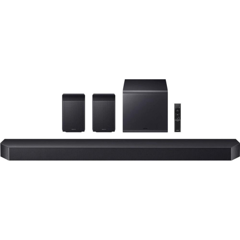 Саундбар Samsung HW-Q990F/UA – це флагманська аудіосистема 2025 року з конфігурацією 11.1.4 каналів, що забезпечує кінематографічний звук із підтримкою Dolby Atmos та DTS:X. Комплект включає основну панель, два бездротові тилові динаміки та компактний сабвуфер з двома 8-дюймовими активними випромінювачами, що забезпечують глибокі та точні низькі частоти. Технологія Q-Symphony дозволяє синхронізувати звук саундбару із динаміками сумісного телевізора Samsung, створюючи більш об'ємне звучання. Функція SpaceFit Sound Pro автоматично калібрує звук залежно від акустики приміщення, а Active Voice Amplifier Pro покращує розбірливість діалогів, аналізуючи контент у реальному часі. Саундбар підтримує бездротове підключення через Wi-Fi та Bluetooth, а також оснащений портами HDMI eARC та оптичним входом для підключення різних пристроїв. Вбудовані голосові помічники, такі як Amazon Alexa та Google Assistant, забезпечують зручне керування. Саундбар Samsung HW-Q990F/UA – це високоякісне рішення для створення домашнього кінотеатру з занурювальним звуком та сучасними функціями.