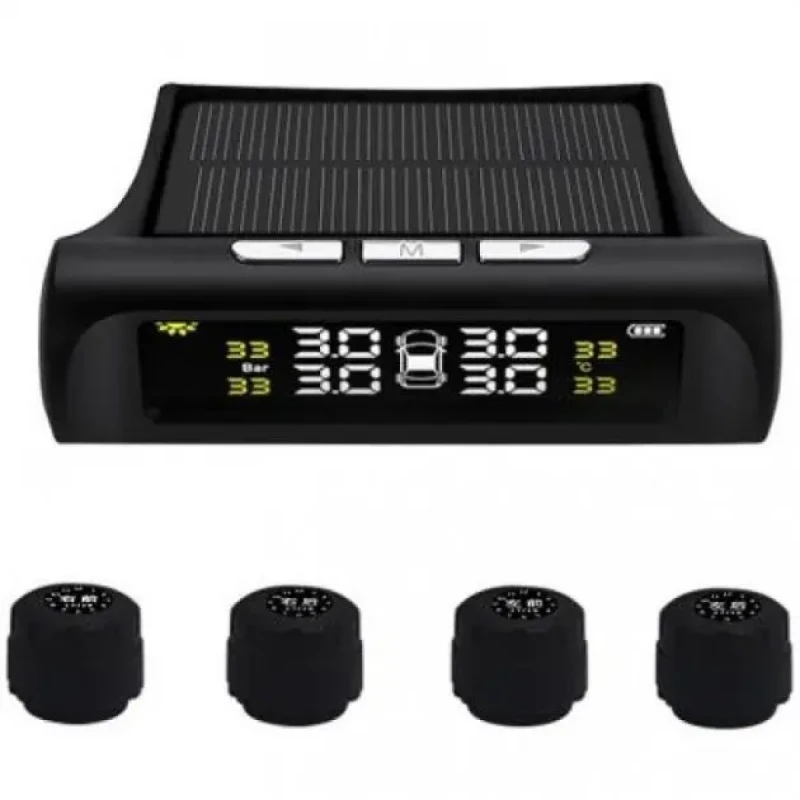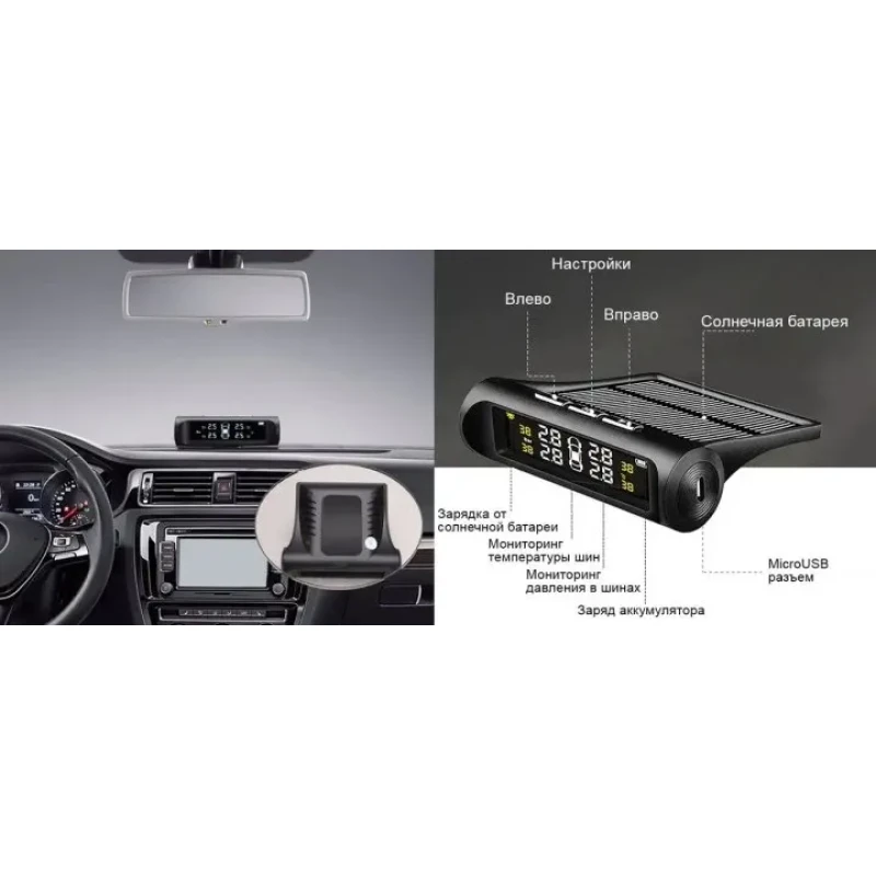 TPMS система контролю тиску в колесах автомобіля. Зовнішні датчики. Самостійне встановлення в автомобілі. Одночасне виведення показників усіх 4 коліс у режимі онлайн. Система антикрадіжок датчиків. Подача живлення на головний пристрій від прикурювача, сонячної батареї. Живлення датчика - батарея 1632. Роздільна здатність тиску: ±0. 1 бар
