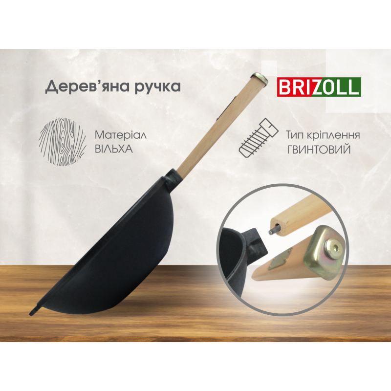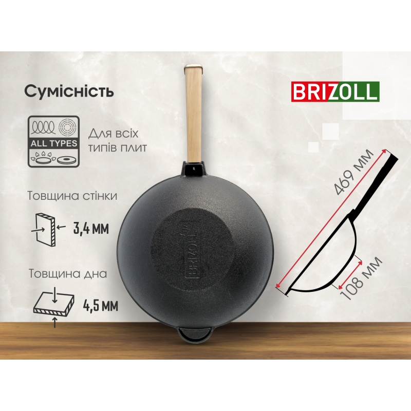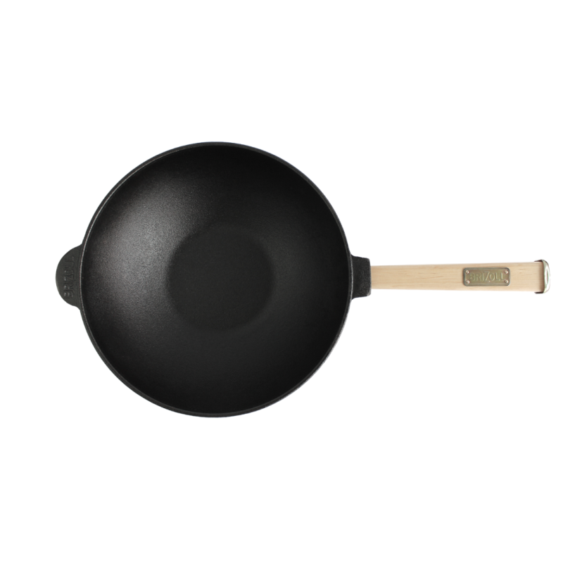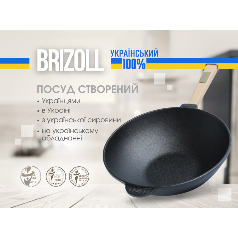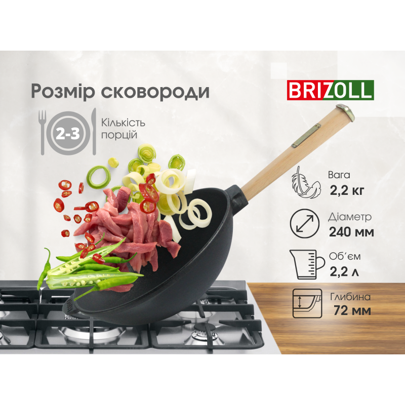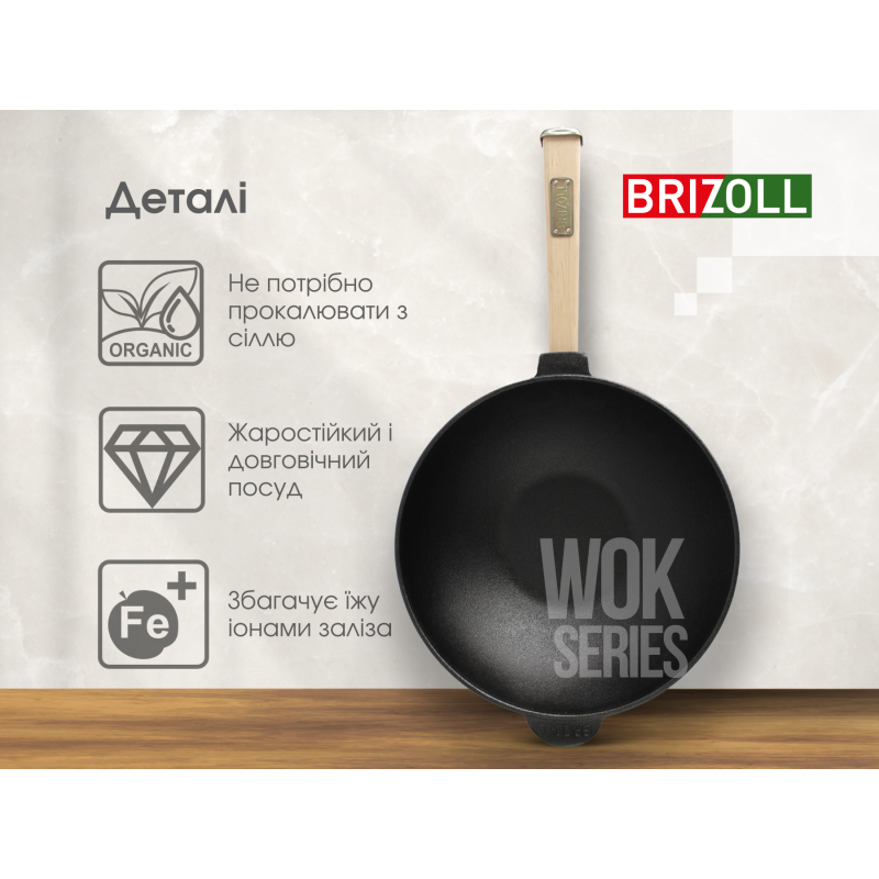 Чавунна сковорода WOK ТМ «BRIZOLL» має ідеальну товщину дна та стінок, яка відповідає стандартам якості, не покрита тефлоновим чи будь-яким іншим покриттям. , а має природні антипригарні властивості, які з часом використовують зростають.