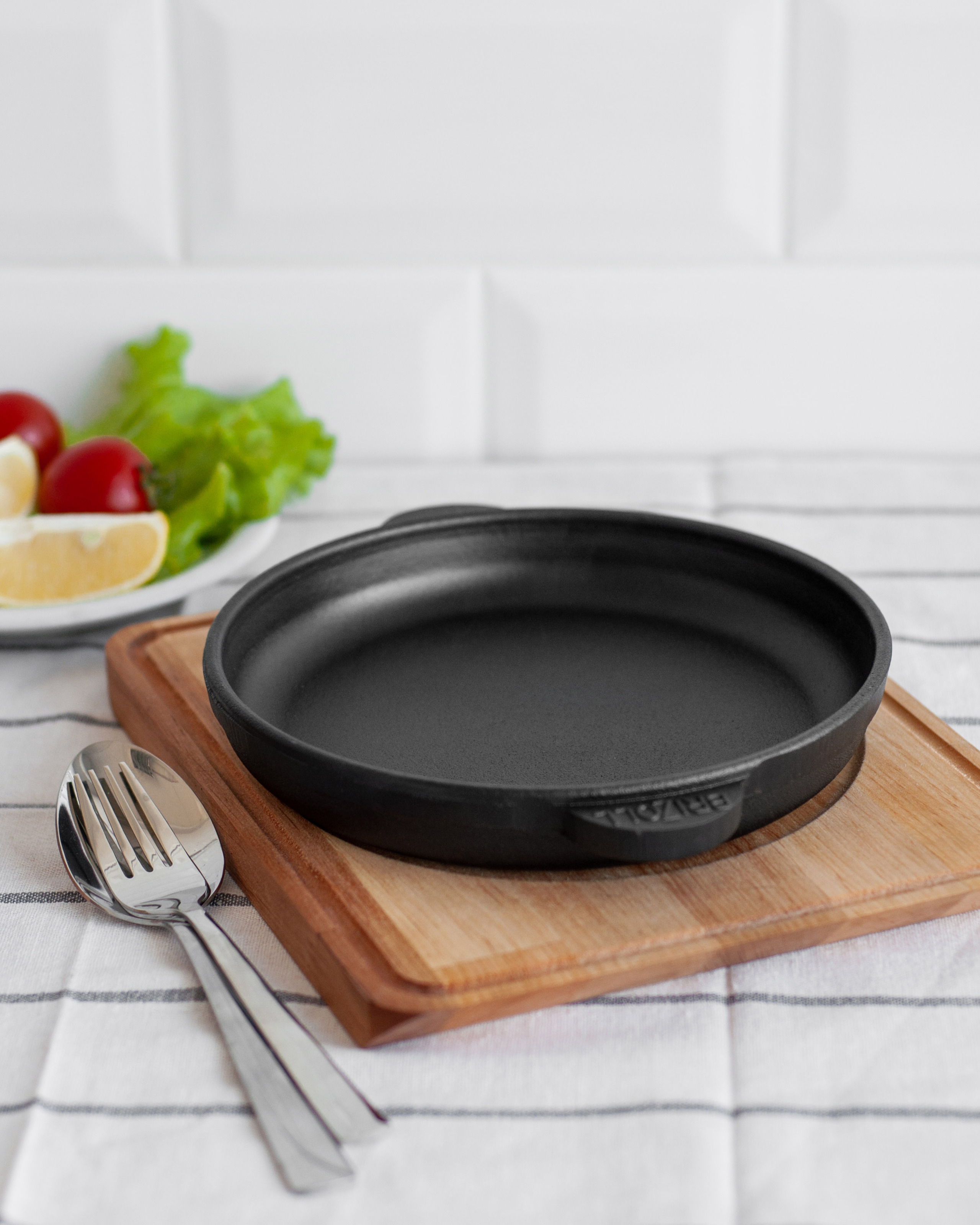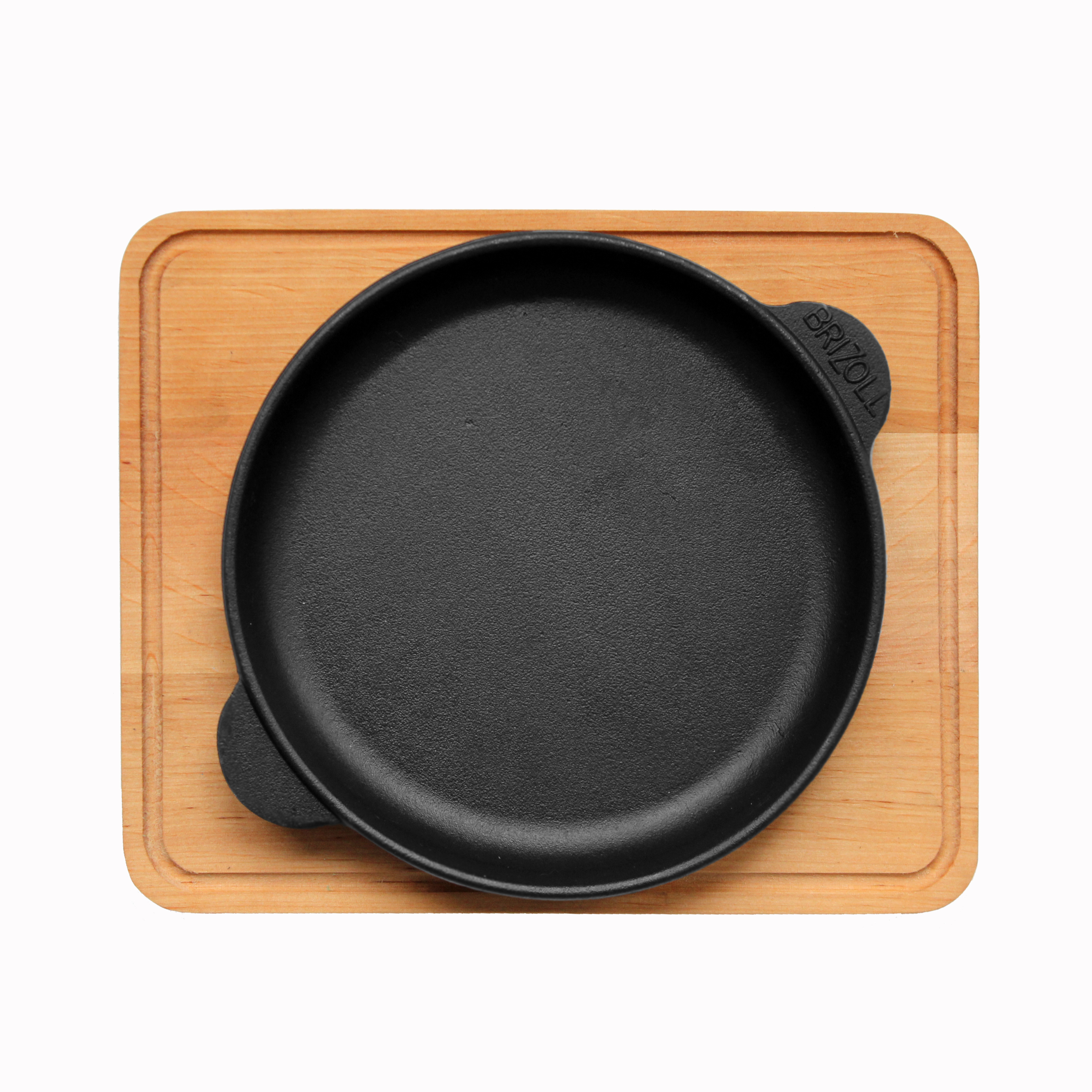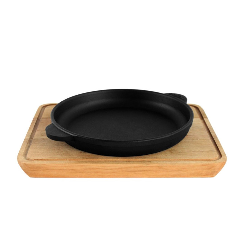 Сковорода порційна чавунна діаметром 200 мм, має литі ручки-вушка і укомплектована дерев'яною підставкою (вільха),