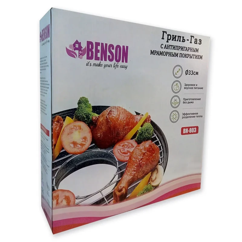 За допомогою Гриль Газ Benson (Антипригарне мармурове) Ви зможете смажити будь-які продукти без утворення шкідливих речовин. Цей «чистий» спосіб приготування відкриє новий смак приготовлених страв без жиру. Ви вже ніколи не захочете повернутися до жирної та шкідливої їжі, що виходить при звичайній смаженні. Їжа, приготовлена на Чудо-грилі, має приголомшливий смак і запах — Ви ніби знову побували на пікніку і отримали задоволення від чудових страв на грилі.