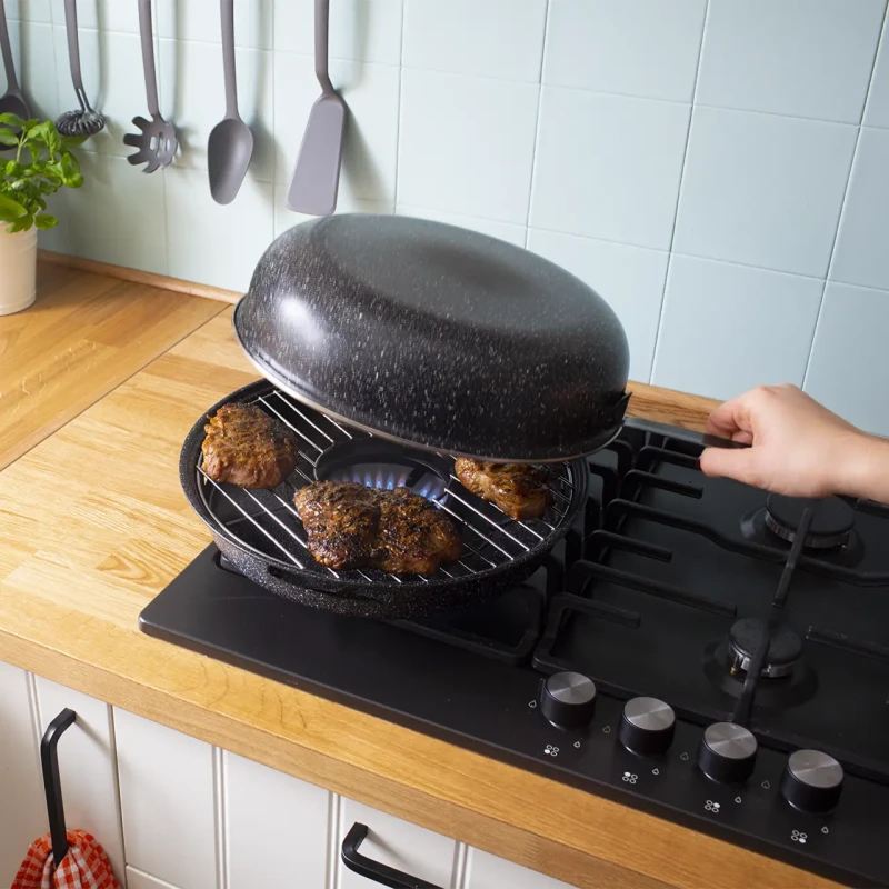 На сковорідці ГРИЛЬ-ГАЗ Benson можна приготувати в домашніх умовах, на газовій плиті, все, що Ви зазвичай готуєте на природі на мангалі. Такі страви як шашлик, запечені овочі, гриби, риба, картопля, засмажені сосиски, різні ковбаски, лаваш, дієтичне м'ясо, котлети, риба тощо можна приготувати за 20-30 хвилин. Користуючись цією сковорідкою, ви заощаджуєте на дровах. Приготування будь-якої страви вп'ятеро економніше, ніж на електричному грилі. Всі страви, приготовані на цій сковорідці набагато корисніші та смачніші, ніж ті, які приготовані на звичайній сковорідці.