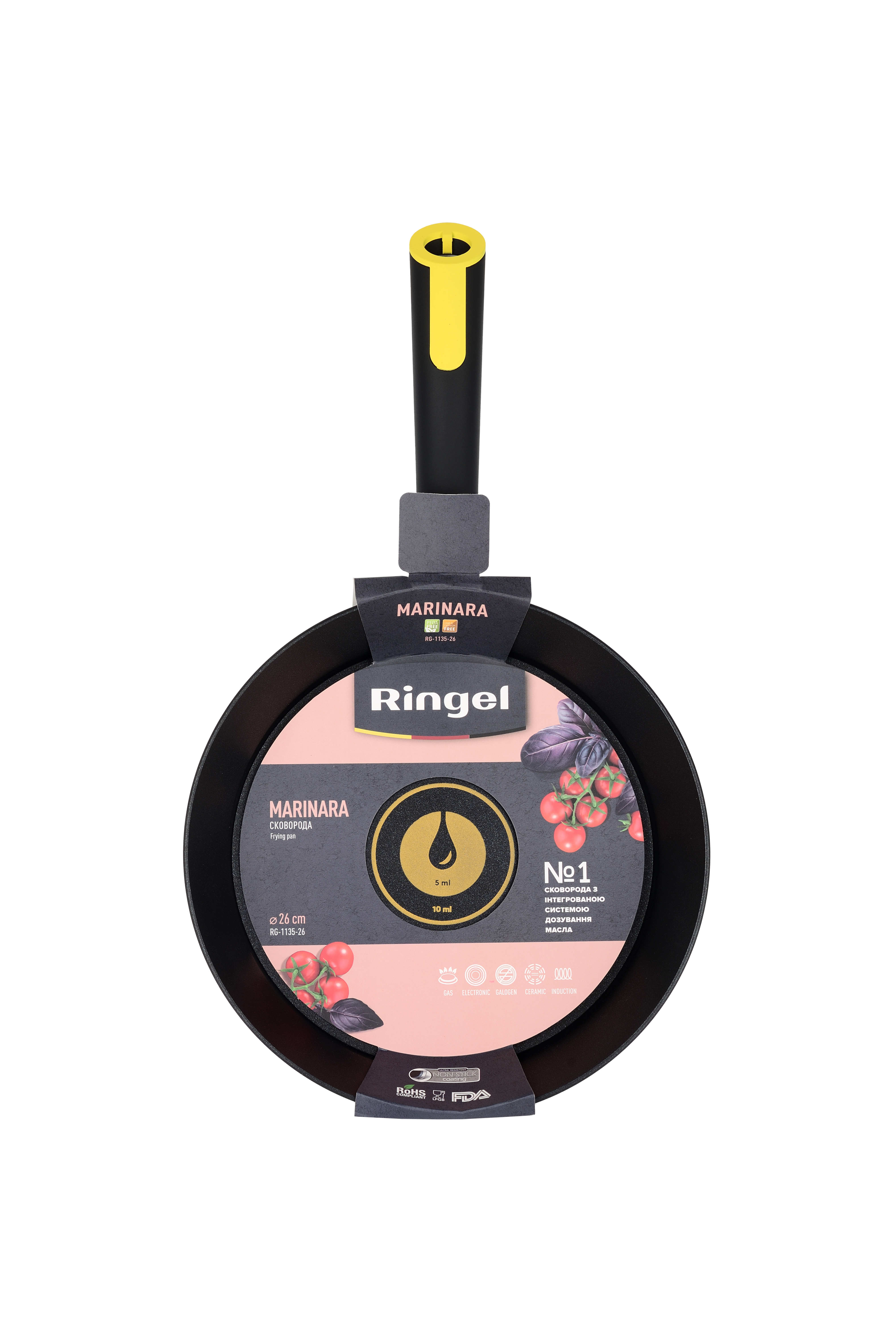 В кожну сковороду RINGEL інтегрована перша в світі система дозування олії. Найменша поділка системи відповідає 5 мл олії, а більша – 10 мл олії. За допомогою цієї системи ви зможете легко та швидко приготувати водночас здорові та смачні страви з використання мінімуму жиру та з максимальним збереженням корисних речовин у страві.