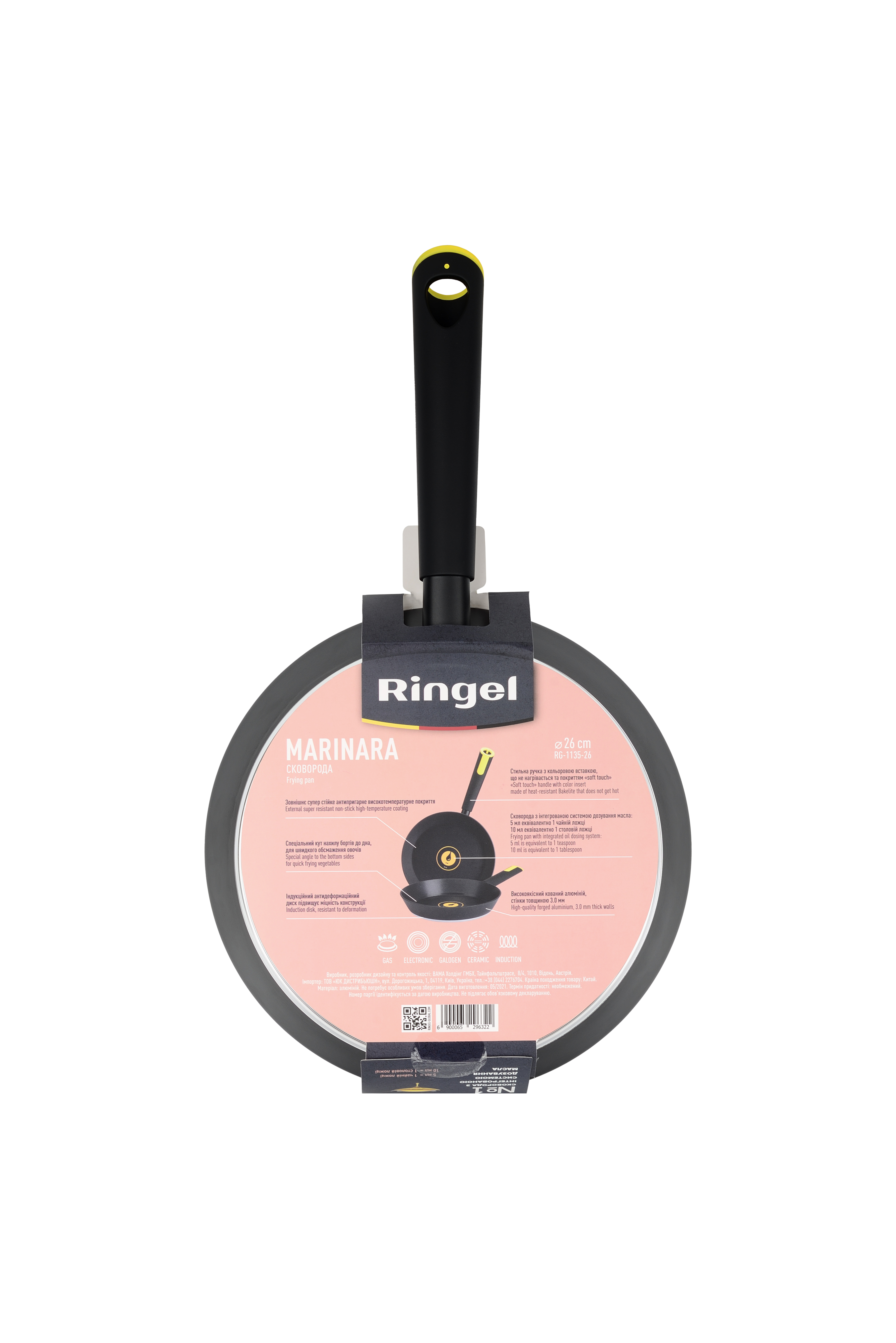 Cковорода MARINARA від Ringel - це універсальний помічник на кухні для готування і розігрівання найрізноманітнішої їжі. Нестандартний кут нахилу борта зроблений як у професійному кухарському посуді. Цей кут нахилу дозволяє готувати овочі з «підкиданням» і швидким обсмаженням. Виготовлені з високоякісного кованого алюмінію, ці сковороди мають товщину 3 мм, є міцним посудом зі швидким і рівномірним нагріванням. У даній серії використовується надстійке тришарове антипригарне покриття, що дозволяє використовувати менше олії при приготуванні.