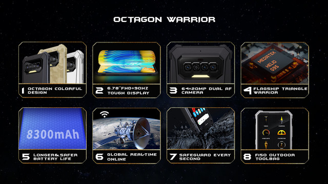 Процесор у смартфоні – Helio G95. Такий чіпсет має непогану продуктивність: 8 ядер та максимальна частота в 2.1 ГГц дозволяють досягти відмінних результатів у роботі. Оперативна пам'ять 8 Гб: тип пам'яті тут LPDDR4X, а це швидка пам'ять. Швидка так само і стала пам'ять, її обсяг вже становить 256 Гб, розширювати її картами пам'яті так само можна. Використовується так само акумулятор ємністю 8300 мАг, якого насправді має вистачати на 2-3 дні. В цілому, параметри смартфона дійсно цікаві, а його особливість полягає у дисплеї та камері нічного зору. Також встановлено модуль NFC, за допомогою якого можна використовувати Google Pay - оплату покупок за допомогою смартфона. Працює смартфон на передовій операційній системі Android 11, яка і дозволяє отримувати доступ до всіх сучасних додатків, а так само працює з нею Oukitel F150 R2022 досить плавно.