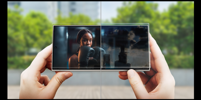 Наш дисплей із найпотужнішим ефектом присутності має кілька суттєвих покращень щодо видимості. Захисне скло Corning® Gorilla® Armor зменшує віддзеркалення та покращує чіткість зображення навіть під дією прямих сонячних променів. Крім того, вдосконалена система Vision Booster покращує контрастність і кольори, забезпечуючи виняткові враження від перегляду.