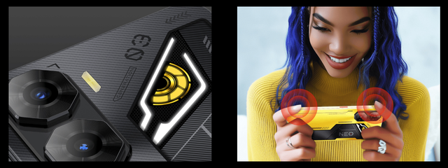Корпус смартфона Nubia Neo 3 втілює футуристичну естетику, в якій продуманий кожен вигин, лінія і деталь для створення унікального зовнішнього вигляду і комфорту використання. Вбудоване RGB-підсвічування виглядає ефектно і доповнює сучасний дизайн пристрою. По кутах рамки розташовані подвійні зони для комфортного розміщення пальців геймера під час гри. Вони забезпечують більш точне управління для ефективного ігрового процесу.