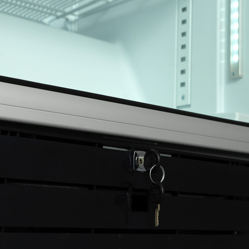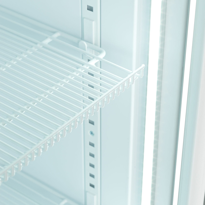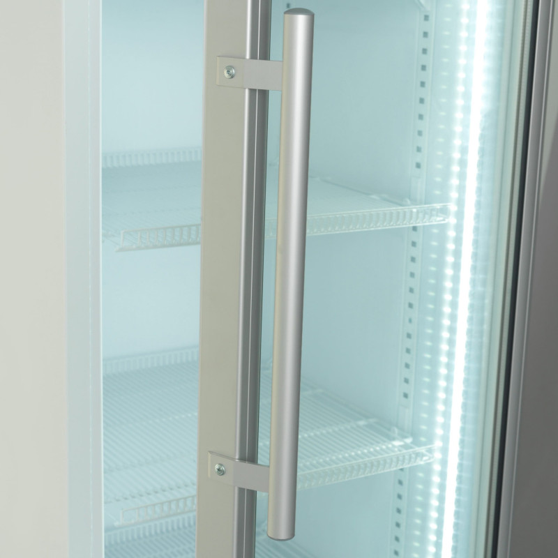 Велика витрина з корисним об'ємом 455 л і динамічним охолодженням для рівномірної температури. Оснащена 5 регульованими дротяними поліцями, скляними дверима з алюмінієвою рамою, вертикальним внутрішнім освітленням та автоматичним розморожуванням.
