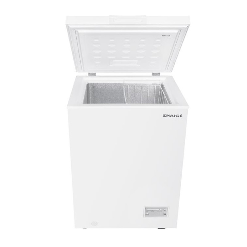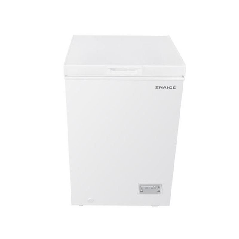 Морозильна скриня Snaige FH10SG-T1000EH об'ємом 98 л з класом енергоспоживання E споживає 168 кВт·год на рік. Електронне керування дозволяє точно встановлювати температуру в діапазоні від -14 до -22 °C, а функція швидкого заморожування прискорює процес для свіжих продуктів. Компактні розміри 550 × 480 × 850 мм та вага 21 кг роблять модель зручною для невеликих приміщень, а рівень шуму 40 дБ не заважає повсякденному користуванню.