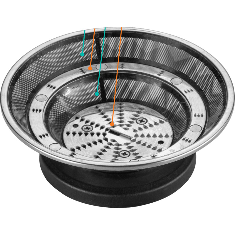 Підвищена ефективність вичавлювання соку завдяки пропусканню фруктів та овочів через спеціально розроблений фільтр. Фрукти перетирають на решітці для подрібнення та виділення соку. М’якоть, яка залишається, проходить через ще одну решітку й сітку, а потім відкладається в окремий кошик.