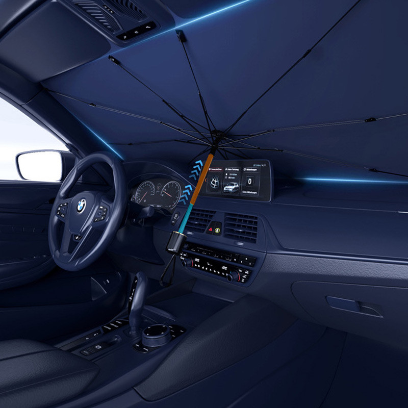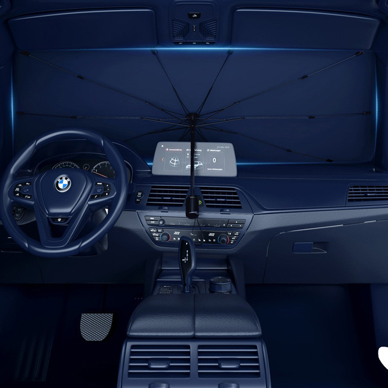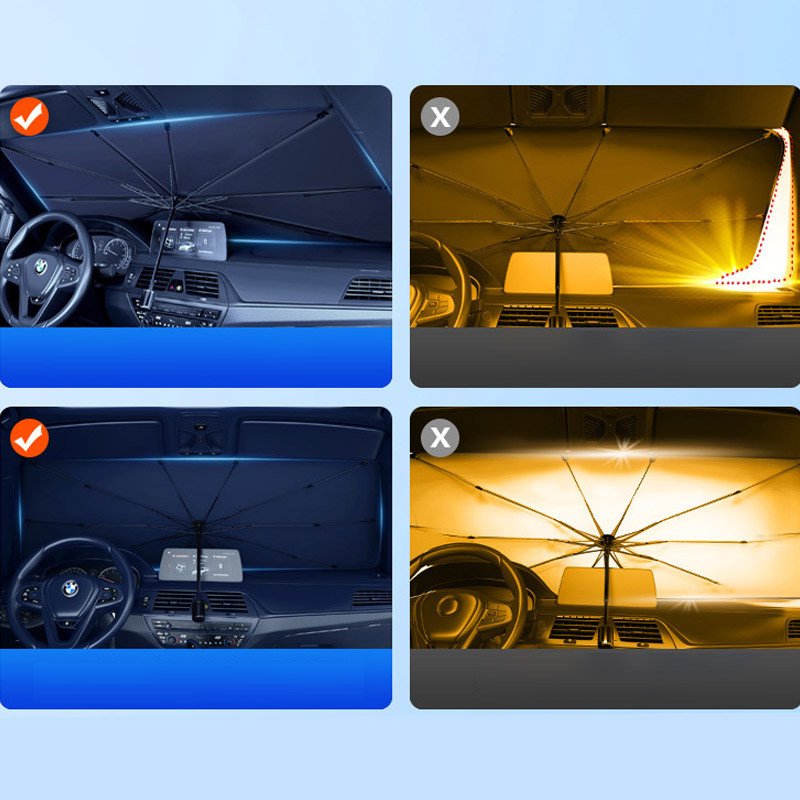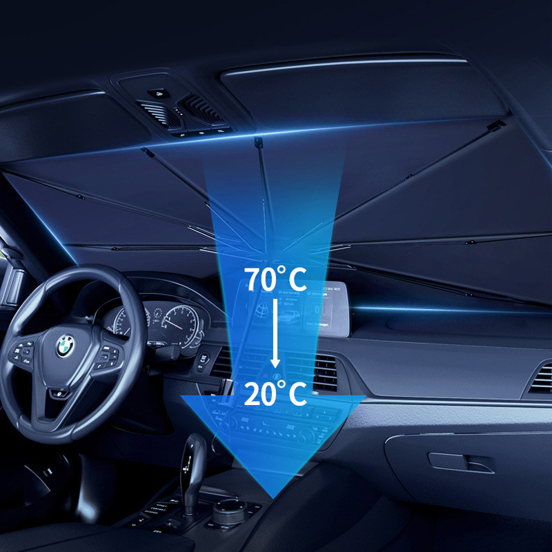 Сонцезахисна парасолька для автомобіля (140×80 см) ефективно захищає салон від спеки та УФ-випромінювання, знижуючи температуру всередині до 30%.