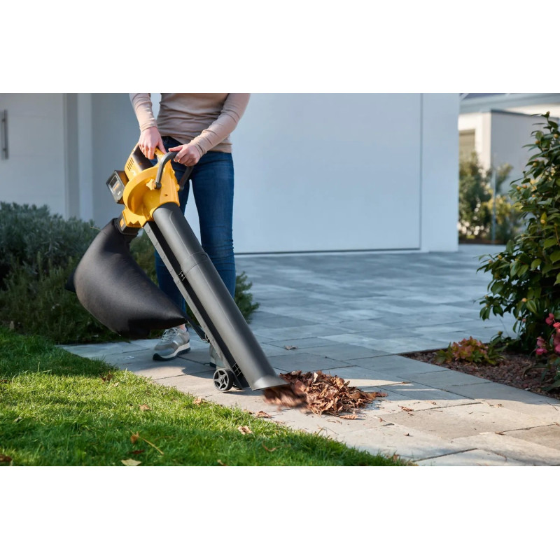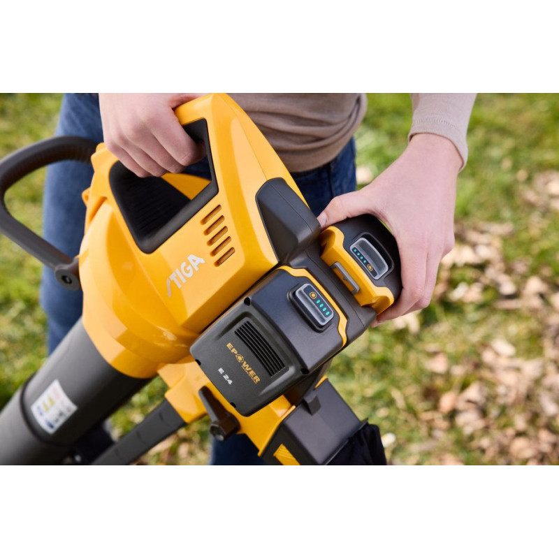 Акумуляторний повітродув-пилосос STIGA VS100eKit працює від двох акумуляторів 20 В по 4 А·год і поєднує функції повітродуву та пилососа. Продуктивність 576 м³/год і мішок об’ємом 45 л дозволяють швидко збирати листя та дрібне сміття. Вбудований подрібнювач зменшує об’єм зібраного матеріалу. Вага 3,64 кг зберігає зручність керування. До комплекту входять два акумулятори та зарядний пристрій.