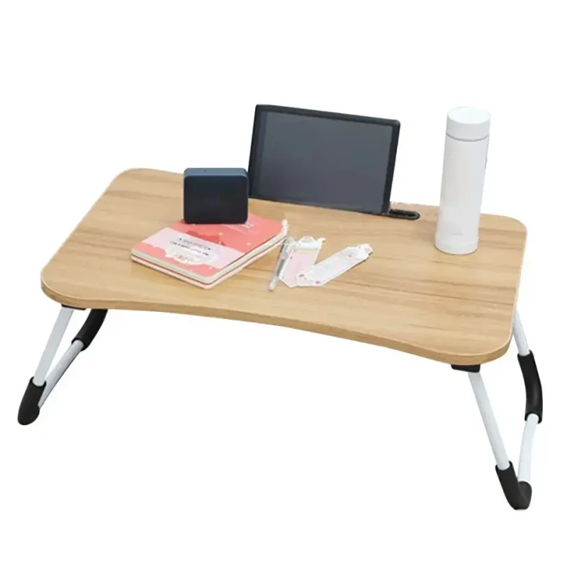 У столі є складні металеві ніжки з прогумованою основою, що протиковзає. Дизайн столу доповнено отвором для планшета, телефону, ручки, склянки та техніки з вузьким екраном.