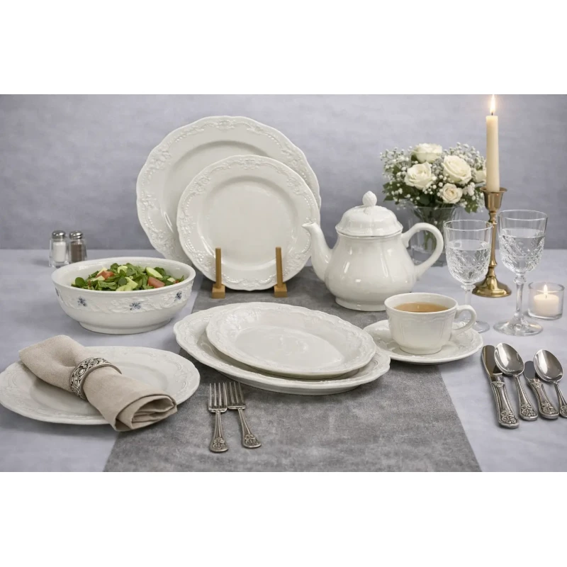 Столовий сервіз DY09 – це втілення чистоти, простоти та елегантності. Такий сервіз легко поєднується з будь-яким декором та сервіруванням, доречно виглядає як у святкові моменти, так і у повсякденному використанні. Це універсальний вибір для тих, хто цінує стриманий стиль та ідеальний смак.