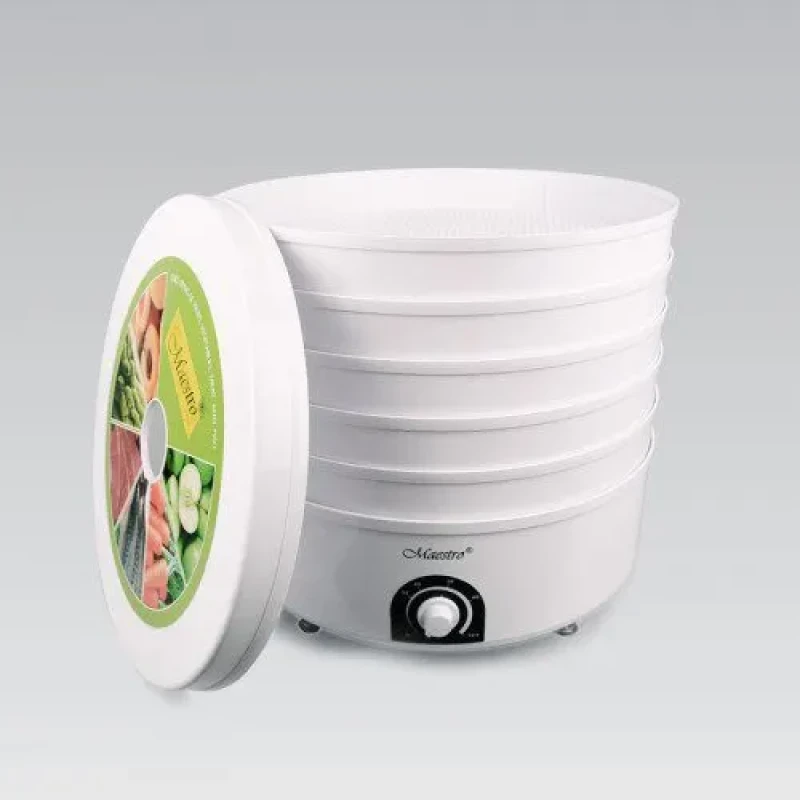 Призначення Для сушіння овочів, ягід, фруктів, м'яса, риби, квітів, лікувальних трав, приготування мюслі Зовнішній термостат Так, для плавного регулювання температури Ергономічний дизайн Так Кількість лотків (сит) 5 Потужність 520 Вт Напруга 220-240 В, 50 Гц Тип використання Побутове Модель Maestro (MR-766) Призначення для побутового використання Так Особливості Багатофункціональність, зручність використання Температурний режим Плавне регулювання температури Сушка для овочів та фруктів Maestro MR-766 — це універсальний прилад потужністю 520 Вт, який чудово підійде для сушіння різних продуктів у домашніх умовах. Вона має 5 лотків (сит), що дозволяє одночасно обробляти значну кількість продуктів, таких як овочі, фрукти, ягоди, м'ясо, риба, квіти та навіть лікувальні трави для створення корисних домашніх запасів або приготування мюслі. Ця модель оснащена зовнішнім термостатом для плавного регулювання температури в межах від 35 до 70C, що забезпечує точне налаштування для сушіння різних типів продуктів. Плавне регулювання температури дозволяє вам досягти ідеальних результатів без шкоди для смаку та корисних властивостей продуктів. Сушка Maestro MR-766 відрізняється ергономічним дизайном, що забезпечує зручність у використанні. Завдяки багатофункціональності, ви зможете швидко адаптувати її під будь-які потреби. Прилад має захист від перегріву, що додає безпеки під час роботи. Це побутове пристосування стане незамінним помічником на вашій кухні, дозволяючи заготовлювати здорові та смачні продукти на зиму або для повсякденного використання. Сушка Maestro MR-766 — це чудове рішення для тих, хто цінує зручність, якість і ефективність при сушінні продуктів.