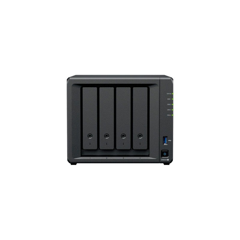 Synology DiskStation DS925+ – це 4-дискове NAS-сховище з чотириядерним процесором AMD Ryzen V1500B та апаратним шифруванням. Має 4 ГБ DDR4 ECC пам'яті (з можливістю розширення до 32 ГБ) і підтримує як HDD, так і NVMe SSD. Оснащене двома 2.5GbE портами, USB 3.2 та можливістю розширення до 9 дисків через DX525.