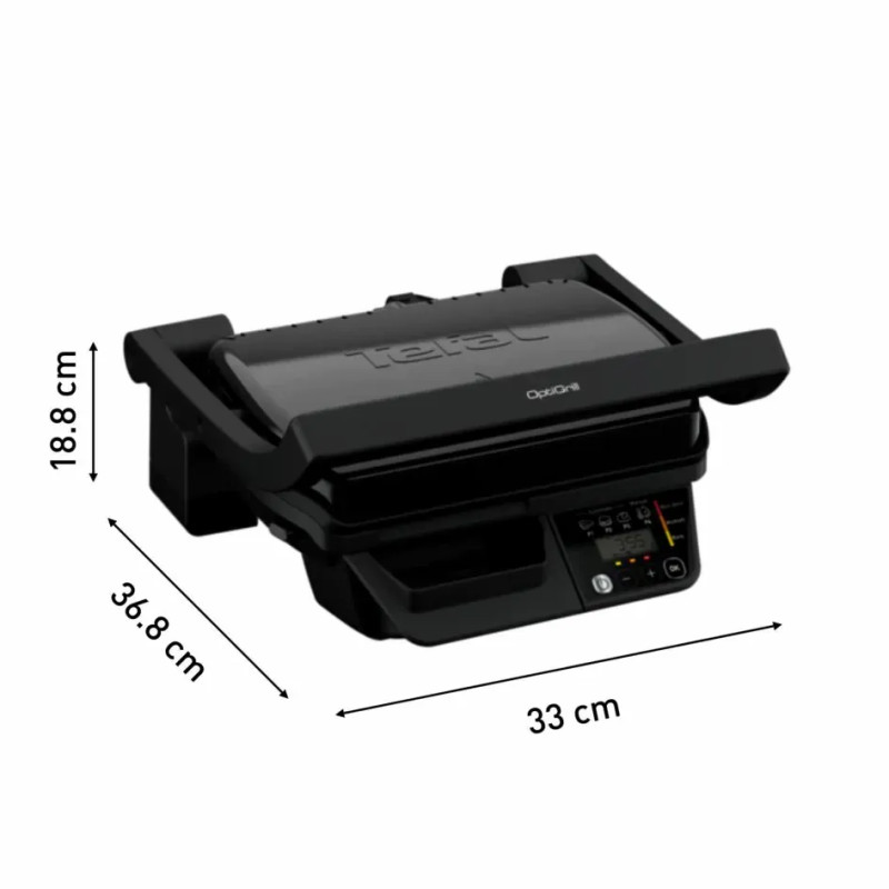 Tefal OptiGrill GC7P0810 — притискний електрогриль 2000 Вт із нержавіючим корпусом та знімними антипригарними пластинами розміром 30х20 см. Автоматично визначає товщину та кількість шматків і підбирає час приготування для точного результату від rare до well-done. Є цифровий екран зі зворотним відліком, 3 автоматичні програми та ручне регулювання температури 120–270 °C. Знімні антипригарні пластини та піддон для жиру придатні для миття у посудомийній машині.