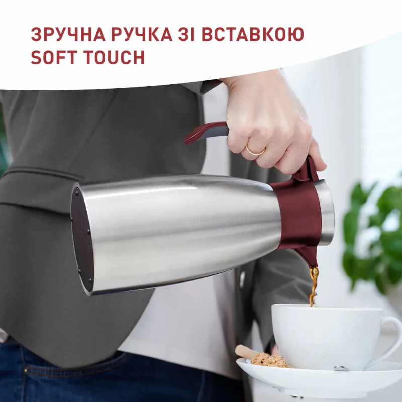 Tefal Soft Grip — термоглечик із подвійними стінками з нержавіючої сталі, що зберігає напої гарячими до 12 годин і холодними до 24 годин. Оснащений кришкою Quick Tip для наливання однією рукою, м’якою нековзною ручкою, герметичною конструкцією та нековзною основою.