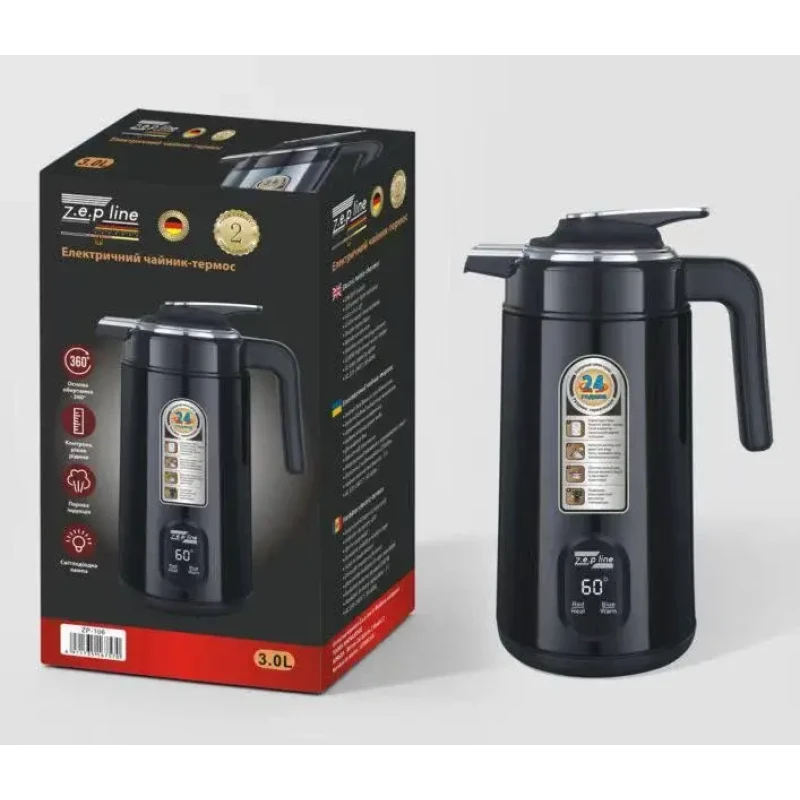Чайник-термос Zepline ZP-123 – поєднує функції чайника та термоса: кип'ятить воду та надалі підтримує її температуру тривалий час. Постійний підігрів води на плиті або за допомогою електрочайника виходить не дешево, а термопот здатний не тільки нагріти воду з мінімальною витратою електрики, але й зберегти воду гарячою.