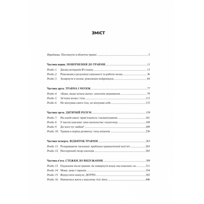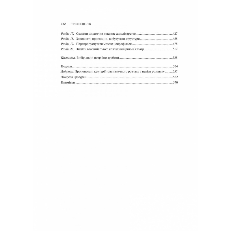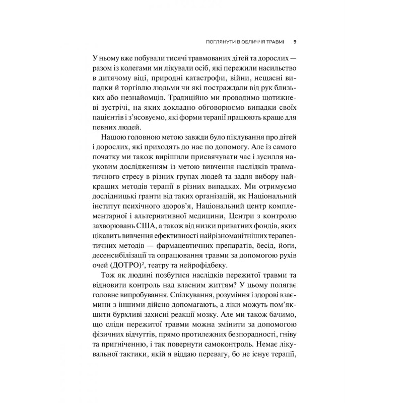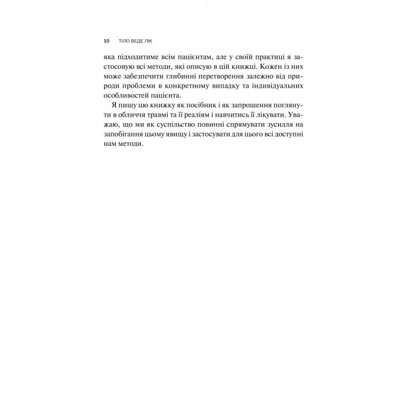 При потужному науковому бекґраунді, книга має доступне викладення та розрахована на широке коло читачів. Автор підказує, як викрити причину своїх страждань, знайти спосіб їх подолання та відновити зв’язок із власною свідомістю, тілом та оточенням. Книга поєднує у собі теоретичні знання та практичні вправи, опитування для самоперевірки на предмет стресових розладів. Вона буде корисна як спеціалістам з ментального здоров’я так і просто людям, які б хотіли покращити своє власне. Боротьба з травмою не має проходити наодинці, і книга стане вірним супутником та помічником на шляху одужання.