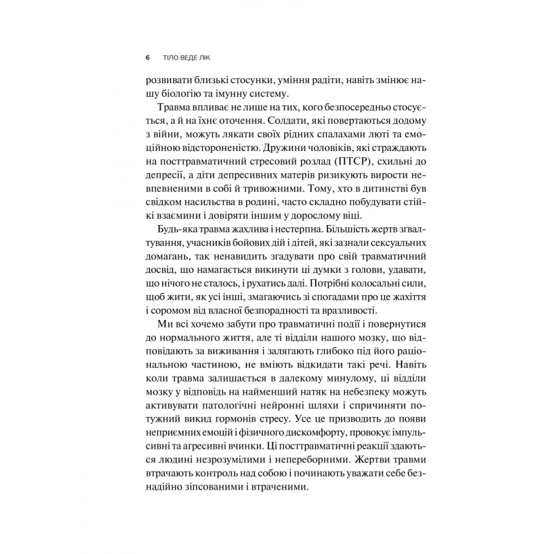 Психічні травми та стрес мають тривалі наслідки, які істотно псують життя та здатні впливати на фізичне самопочуття та здоров’я. Одужанню від емоційних травм, їхній природі, наслідкам та поверненню до здорового життя і присвячена книга «Тіло веде лік. Як лишити психотравми в минулому» професора Бессела Ван дер Колка.
