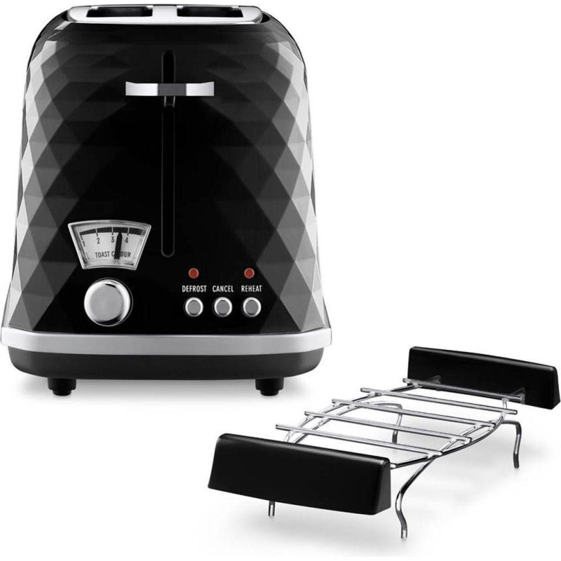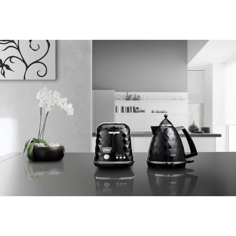 Колекція для сніданку Brillante є прекрасним доказом того, що вишуканий стиль може йти рука об руку із сучасними технологіями. De'Longhi запрошує вас у світ тривимірного дизайну, де вироби дивують своєю формою й неповторною текстурою. Колекція з характерною для De'Longhi ноткою екстравагантності захоплює багатовимірністю поверхонь, а стримані хромовані деталі додають елегантності. Все це створює незвичайне поєднання класики та сучасності, яке додасть блиску вашому інтер'єру відбитим променям світла. Тостер на два скибочки CTJ 2103.BK із серії Brillante підкуповує не тільки своїм дизайном, але передусім функціональністю.