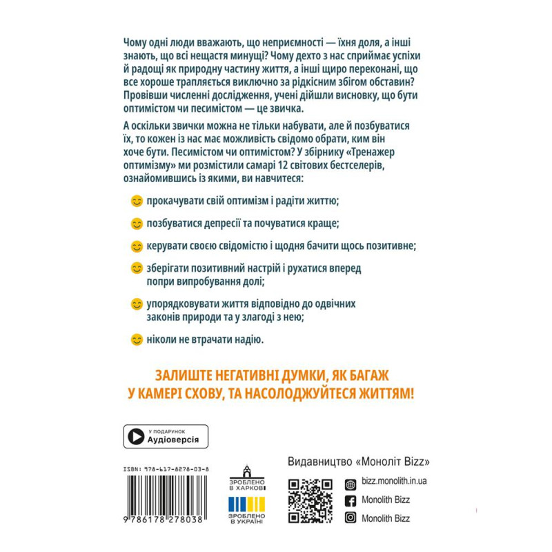 У збірнику «Тренажер оптимізму» ми зібрали самарі 12 світових бестселерів, завдяки яким ви навчитеся: