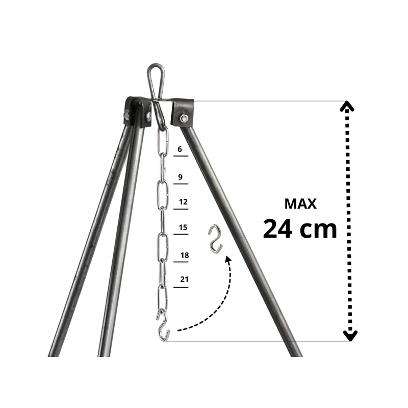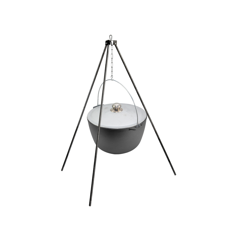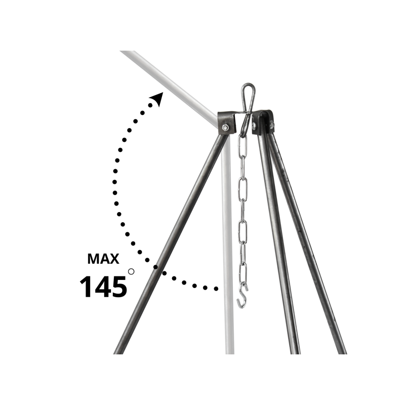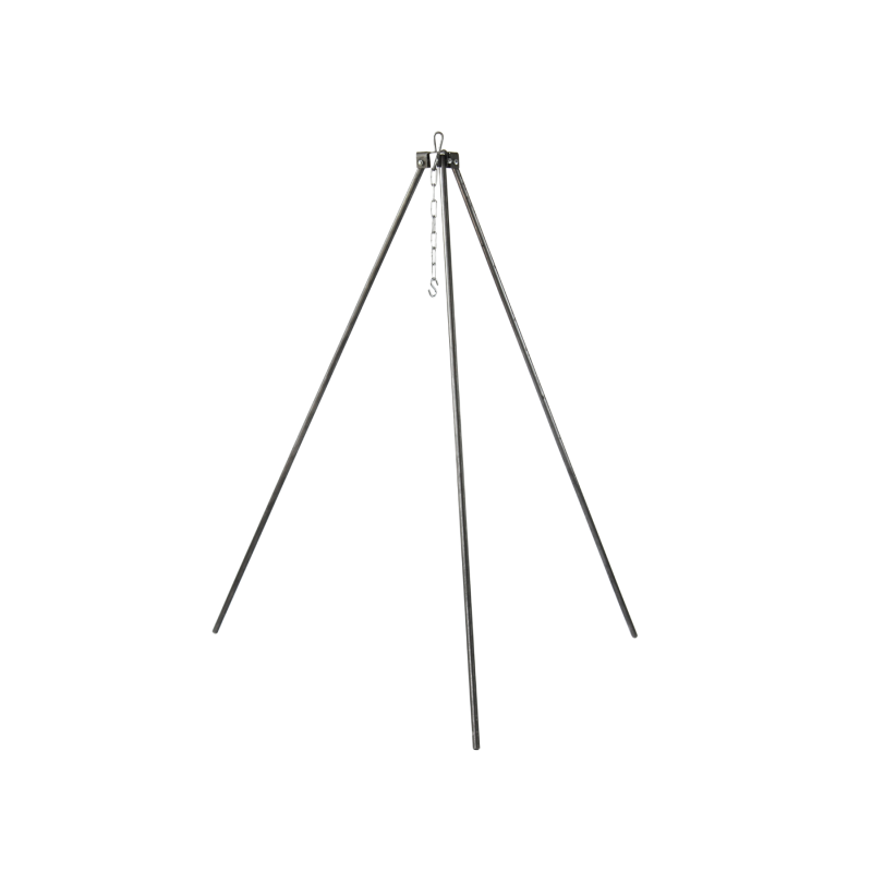 Зручна розладна тринога - практична і універсальна річ для приготування страв в казані. Вона має зручну конструкцію, що доволяє регулювати висоту і ширину розміщення трьох опорних ніжок та забезпечити оптимальне розташування посуду над багаттям. Зручна у транспортуванні, тринога легко складаться/розкладається і не потребує багато місця для зберігання. Надійна металева конструкція зроблена з міцного сплаву, що не деформується. Оснащена ціпком з гачком, що додатково дозволяє регулювати висоту підвісу посуду.