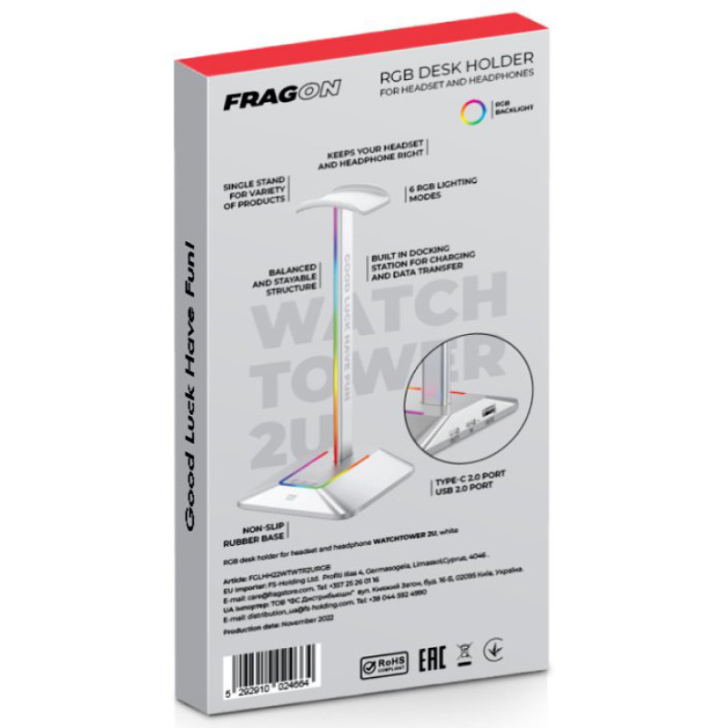 Watchtower 2U – це тримач гарнітури преміум-класу з підсвічуванням RGB, що підтримує шість режимів, та вбудованою системою док-станції, що дозволяє легко заряджати та передавати дані на пристрої завдяки портам USB Type-C та USB 2.0. Крім того, він може похвалитися збалансованою та стабільною конструкцією та нековзною гумовою основою, яка забезпечує надійне кріплення гарнітури на місці, запобігаючи випадковому ковзанню або падінню. Зробіть свій стіл зручнішим за допомогою цього витонченого та функціонального тримача для вільного робочого простору.