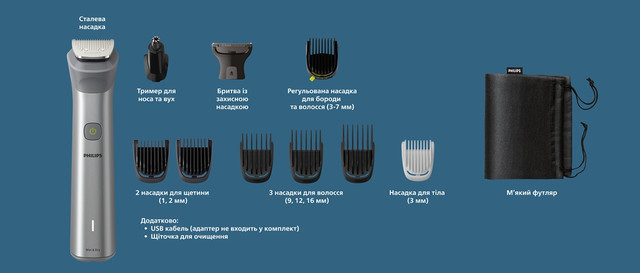 Цей універсальний тример з різними насадками пропонує 11 налаштувань довжини від 0,5 до 16 мм для рівномірного підстригання.