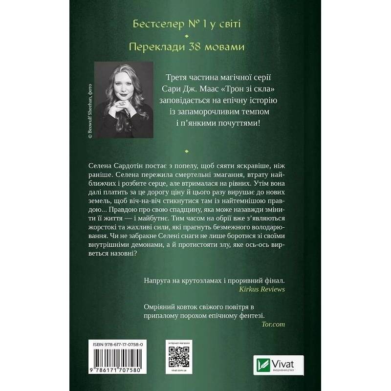 Анотація: Селена Сардотін постає з попелу, щоб сяяти яскравіше, ніж раніше. Селена пережила смертельні змагання, втрату найближчих і розбите серце, але втрималася на рівних. Утім вона далі платить за це дорогу ціну й цього разу вирушає до нових земель, щоб віч-на-віч стикнутися там із найтемнішою правдою… Правдою про свою спадщину, яка може назавжди змінити її життя — і майбутнє. Тим часом на обрії вже з’являються жорстокі та жахливі сили, які прагнуть безмежного володарювання. Чи не забракне Селені снаги не лише боротися зі своїми внутрішніми демонами, а й протистояти злу, яке ось-ось вирветься назовні?