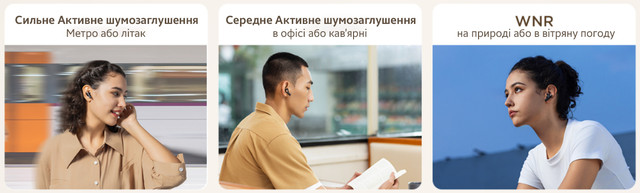 Вибирайте відповідний рівень шумозаглушення, залежно від того, чи знаходитесь ви в дуже галасливому місці, насолоджуєтеся музикою в затишному кафе або вийшли на пробіжку у вітряну погоду. Ексклюзивна технологія адаптивного шумоподавлення блокує навколишні шуми до 42 дБ, дозволяючи вам насолоджуватися нюансами улюбленої музики в будь-якому місці.