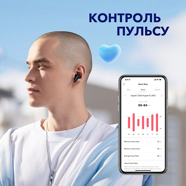 Внутрішньоканальний датчик серцевого ритму відстежує частоту серцевих скорочень під час прослуховування музики протягом дня. Носіть бездротові навушники Liberty 4 та перевіряйте свої щоденні дані під час тренування та багато іншого за допомогою програми Soundcore Wellness.