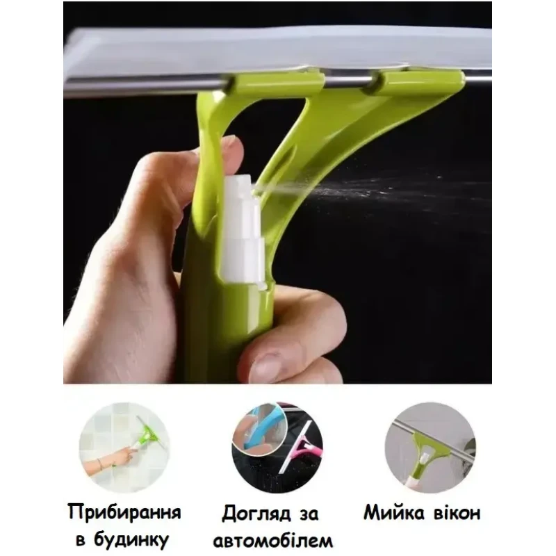 Багатофункціональний склоочисник із розпилювачем. У цього на вигляд простого склоочисника, є розпилювач, а також ємність в ручці для рідкого засобу, що чистить. Заливаєте рідину, розпорошуєте на поверхню і відразу видаляєте весь бруд разом з засобом для чищення.