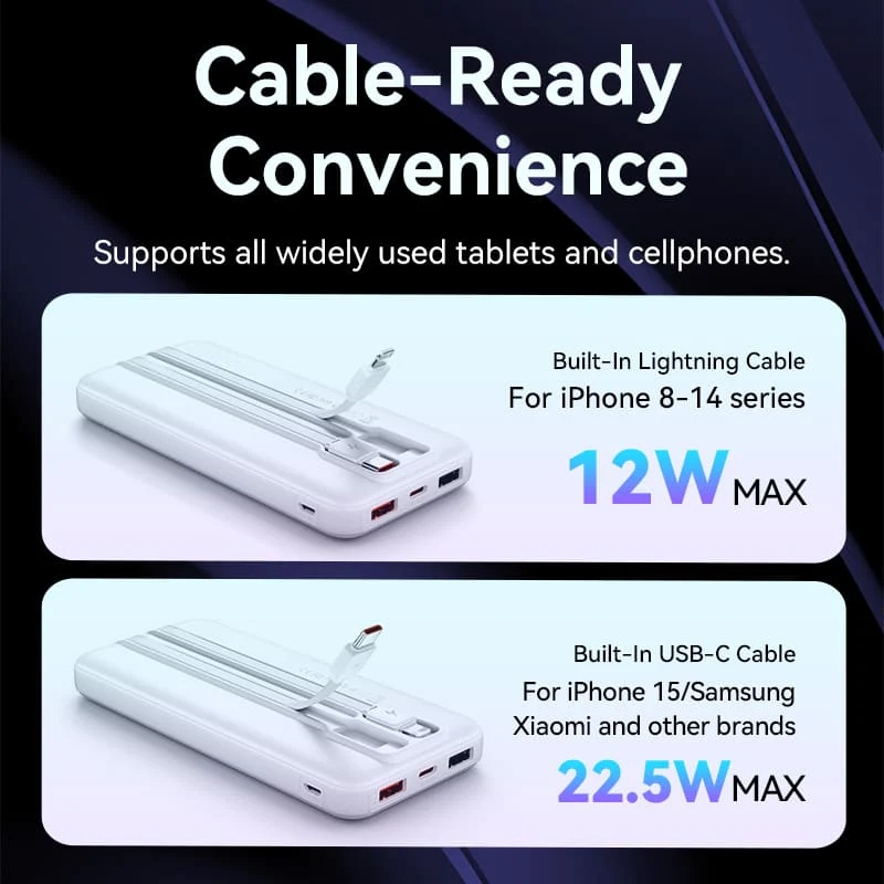 Вбудований кабель Lightning сумісний з iPhone 8-14 серій. Його максимальна зарядна потужність - 12 Вт. Використовуйте кабель USB-C з потужністю до 22,5 Вт для підзарядки смартфонів iPhone 15, Samsung, Xiaomi та USB пристроїв інших брендів.