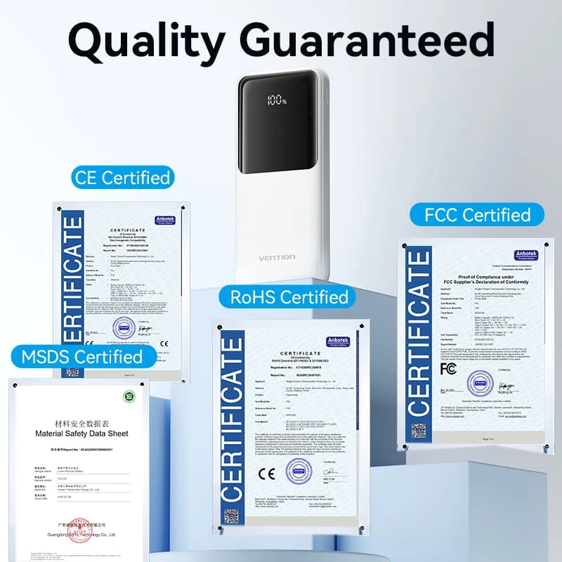 Інтегрований захист від перевантаження за струмом, перенапруги, перезарядки, перерозрядки, перегріву та короткого замикання робить батарею Vention 10000mAh 22.5W безпечною для вас і ваших пристроїв.