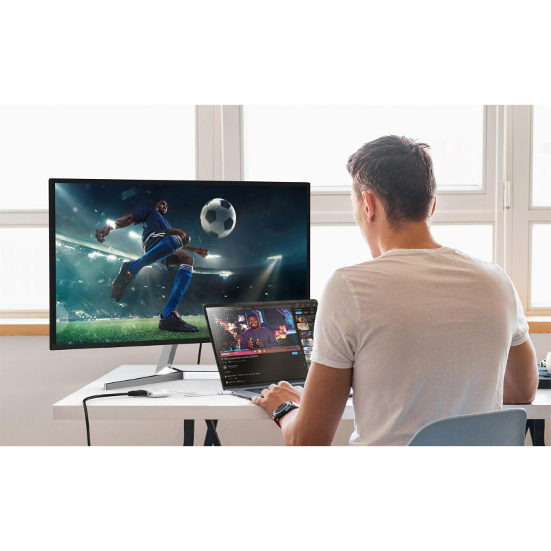 Цей адаптер дозволяє підключити до вашого пристрою дисплей, наприклад монітор або телевізор, і підтримує роздільну здатність до 4K 144 Гц. Також має порт USB Type-A 5 Гбіт/с і порт USB-C Power Delivery, який можна використовувати для заряджання ноутбука, коли підключено адаптер живлення USB-C.